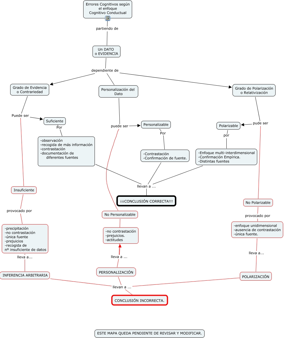 Ecognitivos, Personalización del Dato puede ser No Personalizable, Errores Cognitivos según el enfoque Cognitivo Conductual partiendo de Un DATO o EVIDENCIA, Insuficiente provocado por -precipitación -no contrastación -única fuente -prejuicios -recogida de nº insuficiente de datos, -Enfoque multi-interdimensional -Confirmación Empírica. -Distintas fuentes llevan a ... ¡¡¡CONCLUSIÓN CORRECTA!!!, Grado de Evidencia o Contrariedad Puede ser Suficiente, Suficiente Por -observación -recogida de más información -contrastación -documentación de diferentes fuentes, No Personalizable lleva a ... -no contrastación -prejuicios. -actitudes, No Personalizable lleva a ... PERSONALIZACIÓN, -enfoque unidimensional -ausencia de contrastación -única fuente. lleva a... POLARIZACIÓN, POLARIZACIÓN llevan a ... CONCLUSIÓN INCORRECTA.