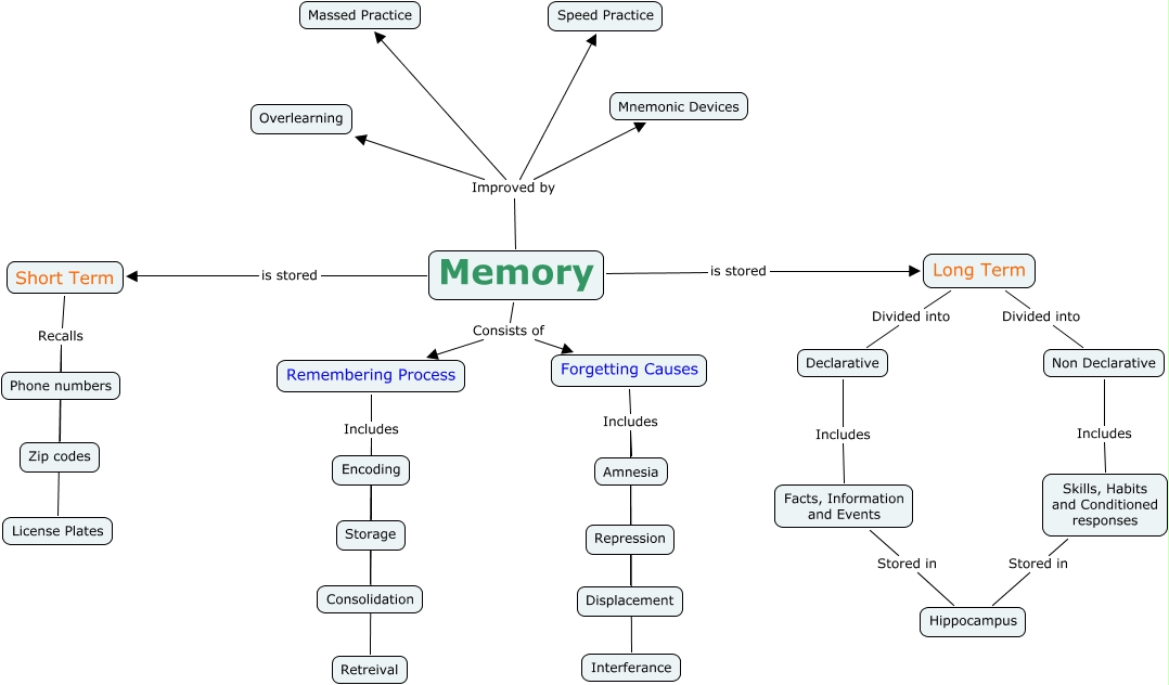 Brittany Naggatz, Remembering Process Includes Encoding, Short Term Recalls Zip codes, Remembering Process Includes Consolidation, Short Term Recalls License Plates, Long Term Divided into Declarative, Memory Improved by Overlearning, Declarative Includes Facts, Information and Events, Memory Improved by Speed Practice, Facts, Information and Events Stored in Hippocampus, Non Declarative Includes Skills, Habits and Conditioned responses