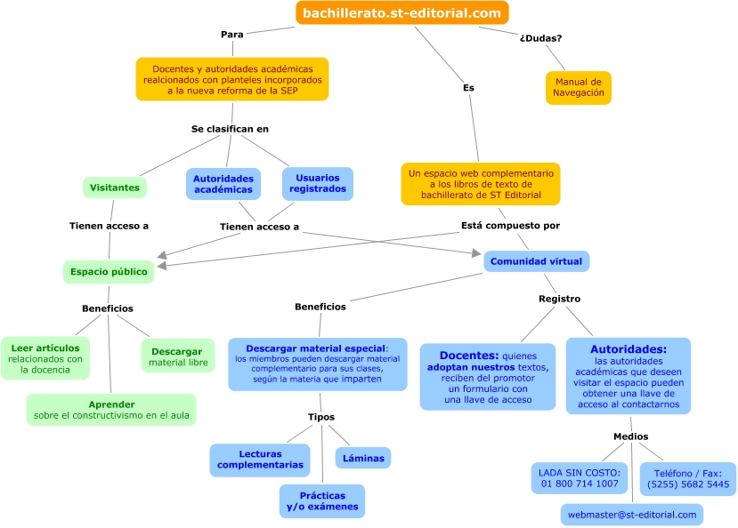 Navegacion, Un espacio web complementario a los libros de texto de bachillerato de ST Editorial Está compuesto por Comunidad virtual, Docentes y autoridades académicas realcionados con planteles incorporados a la nueva reforma de la SEP Se clasifican en Visitantes, bachillerato.st-editorial.com Es Un espacio web complementario a los libros de texto de bachillerato de ST Editorial, Visitantes Tienen acceso a Espacio público, Docentes y autoridades académicas realcionados con planteles incorporados a la nueva reforma de la SEP Se clasifican en Usuarios registrados, Comunidad virtual Registro Autoridades: las autoridades académicas que deseen visitar el espacio pueden obtener una llave de acceso al contactarnos, Autoridades académicas Tienen acceso a Comunidad virtual, Espacio público Beneficios Aprender sobre el constructivismo en el aula, Autoridades académicas Tienen acceso a Espacio público, Usuarios registrados Tienen acceso a Espacio público