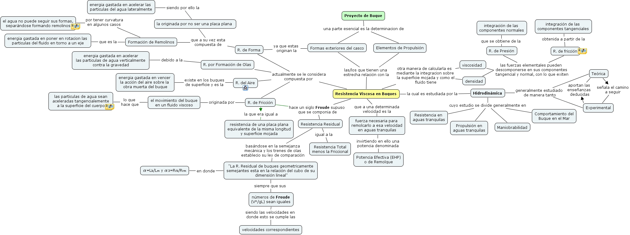 Resistencia Viscosa-1, fuerza necesaria para remolcarlo a esa velocidad en aguas tranquilas invirtiendo en ello una potencia denominada Potencia Efectiva (EHP) o de Remolque, Resistencia Residual igual a la Resistencia Total menos la Friccional, R. de Presión que se obtiene de la integración de las componentes normales, Experimental aportan las enseñanzas deducidas Teórica, Resistencia Viscosa en Buques actualmente se le considera compuesta por R. del Aire, Resistencia Viscosa en Buques actualmente se le considera compuesta por R. por Formación de Olas, Resistencia Viscosa en Buques hace un siglo Froude supuso que se componia de R. de Fricción, Formación de Remolinos que es la energia gastada en poner en rotacion las particulas del fluido en torno a un eje, Hidrodinámica cuyo estudio se divide generalmente en Maniobrabilidad, la originada por no ser una placa plana siendo por ello la energia gastada en acelerar las particulas del agua lateralmente