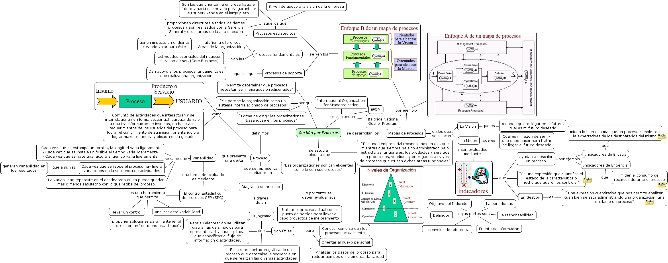 Gestión por Procesos, Son útiles para Utilizar el proceso actual como punto de partida para llevar a cabo proyectos de mejoramiento, ayudan a describir un proceso por ejemplo Indicadores de Eficiencia, La Visión que es A donde quiero llegar en el futuro, cual es mi futuro deseado, Procesos estratégicos aquellos que proporcionan directrices a todos los demás procesos y son realizados por la Gerencia General y otras áreas de la alta dirección, Gestión por Procesos lo recomiendan EFQM, Gestión por Procesos definimos Proceso, “El mundo empresarial reconoce hoy en dia, que mientras que siempre ha sido administrado bajo estructuras funcionales, los productos y servicios son producidos, vendidos y entregados a través de procesos que cruzan dichas áreas funcionales” y son evaluados mediante , cuyas partes son: La responsabilidad, Cada vez que se repite el proceso hay ligera variaciones en la secuencia de actividades que a su vez generan variabilidad en los resultados, Gestión por Procesos se desarrollan los Mapas de Procesos