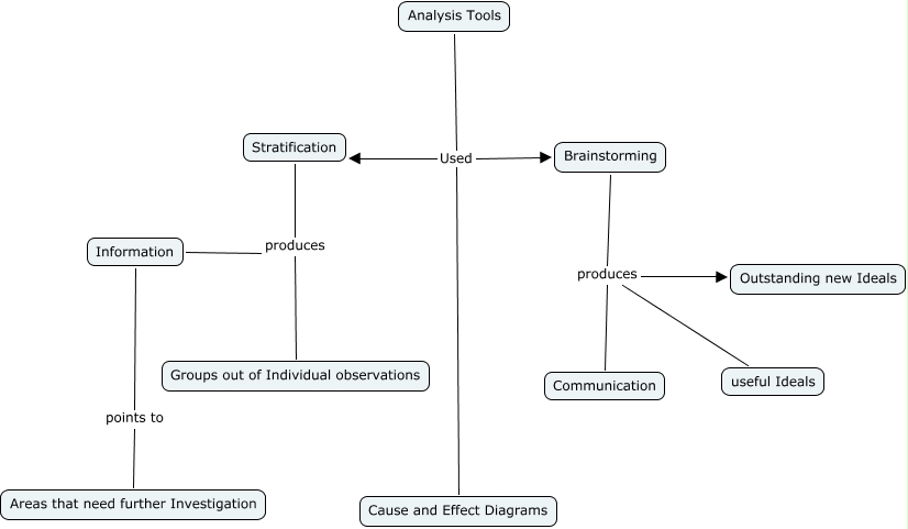 Analysis Tool, Analysis Tools Used Cause and Effect Diagrams, Brainstorming produces Outstanding new Ideals, Brainstorming produces Communication, Analysis Tools Used Stratification, Analysis Tools Used Brainstorming, Brainstorming produces useful Ideals