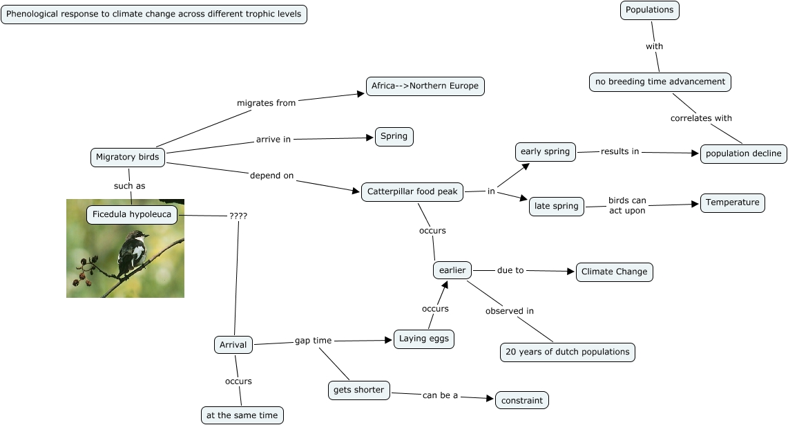 Climate Change and population decilines in migratory birds, Migratory birds such as Ficedula hypoleuca, Catterpillar food peak in late spring, Laying eggs occurs earlier, Ficedula hypoleuca ???? Arrival, Populations with no breeding time advancement, earlier due to Climate Change, late spring birds can act upon Temperature, Catterpillar food peak in early spring, early spring results in population decline, gets shorter can be a constraint