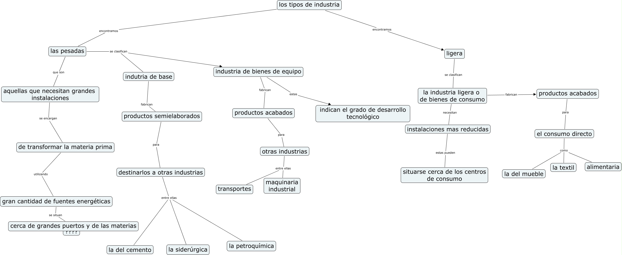 los tipos de industria, industria de bienes de equipo estas indican el grado de desarrollo tecnológico, productos semielaborados para destinarlos a otras industrias, cerca de grandes puertos y de las materias ???? ????, las pesadas se clasifican indutria de base, destinarlos a otras industrias entre ellas la petroquímica, gran cantidad de fuentes energéticas se situan cerca de grandes puertos y de las materias, otras industrias entre ellas transportes, las pesadas que son aquellas que necesitan grandes instalaciones, instalaciones mas reducidas estas pueden situarse cerca de los centros de consumo, el consumo directo como la del mueble