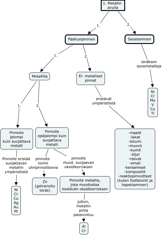 päällystäminen, Seostaminen teräksen seosmetalleja Ni Cr Mo V Cu Ti, Metallilla 1. Pinnoite jalompi kuin suojattava metalli, Pinnoite metallia, joka muodostaa kestävän oksidikerroksen jolloin, metallin pinta passivoituu Al Cr, Päällystäminen 1. Metallilla, Ei- metalliset pinnat eristävät ympäristöstä -maalit -lakat -bitumi -muovit -kumit -öljyt -rasvat -emali -keraamiset -komposiitit -reaktiopinnoitteet (kuten fosfatointi ja hapettaminen), Pinnoite jalompi kuin suojattava metalli Pinnoite eristää suojattavan metallin ympäristöstä Ni Cr Cu Ag Au Pt, Metallilla 2. Pinnoite epäjalompi kuin suojattava metalli, Päällystäminen 2. Ei- metalliset pinnat, Pinnoite epäjalompi kuin suojattava metalli pinnoite muod. suojaavan oksidikerroksen Pinnoite metallia, joka muodostaa kestävän oksidikerroksen, 1. Metallin avulla 1. Päällystäminen