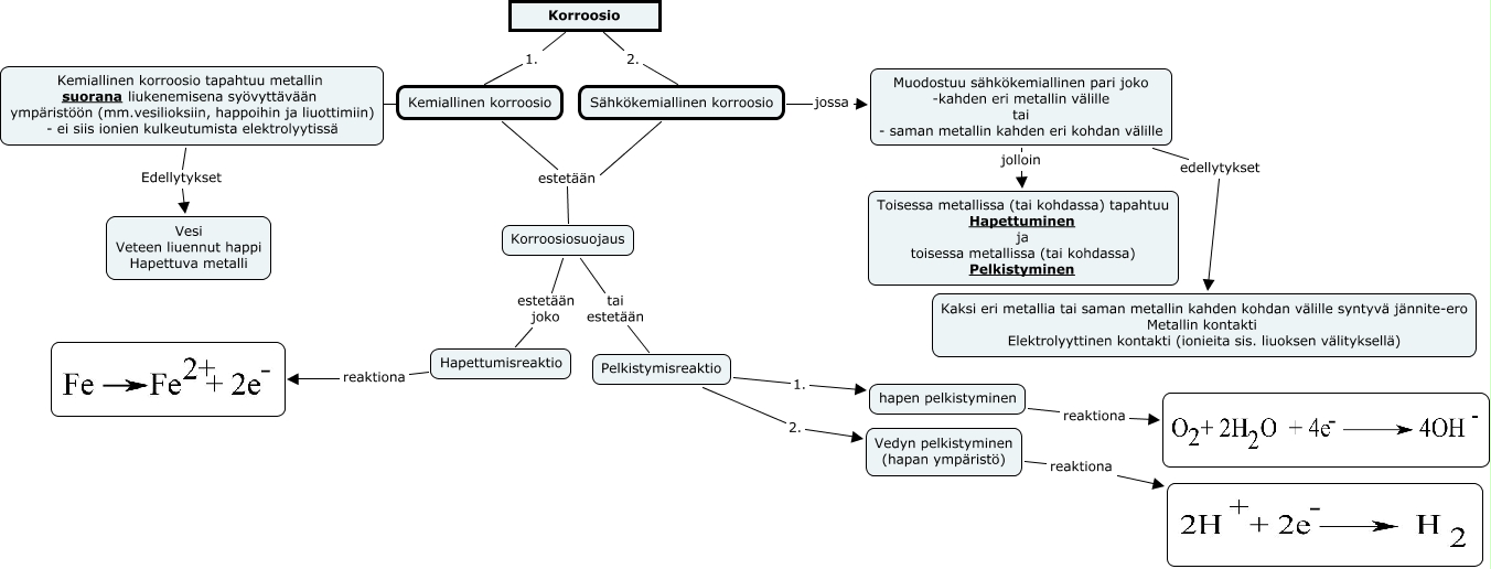 Korroosio, Sähkökemiallinen korroosio jossa Muodostuu sähkökemiallinen pari joko -kahden eri metallin välille tai - saman metallin kahden eri kohdan välille, hapen pelkistyminen reaktiona , Vedyn pelkistyminen (hapan ympäristö) reaktiona , Pelkistymisreaktio 1. hapen pelkistyminen, Korroosio 2. Sähkökemiallinen korroosio, Kemiallinen korroosio estetään Korroosiosuojaus, Kemiallinen korroosio ???? Kemiallinen korroosio tapahtuu metallin suorana liukenemisena syövyttävään ympäristöön (mm.vesilioksiin, happoihin ja liuottimiin) - ei siis ionien kulkeutumista elektrolyytissä, Korroosiosuojaus tai estetään Pelkistymisreaktio, Korroosiosuojaus estetään joko Hapettumisreaktio, Pelkistymisreaktio 2. Vedyn pelkistyminen (hapan ympäristö)