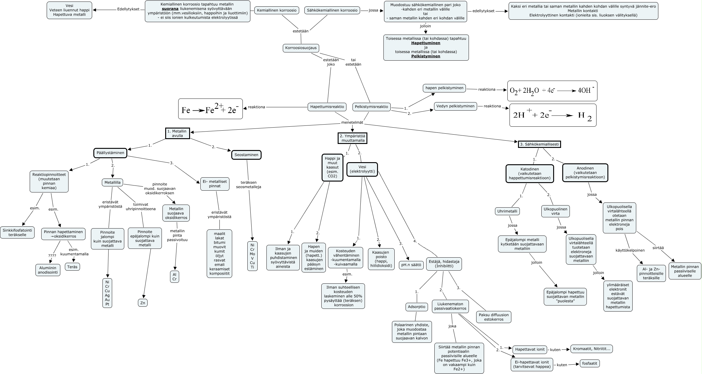 Korroosiosuojaus, Ulkopuolinen virta jossa Ulkopuolisella virtalähteellä tuotetaan elektroneja suojattavaan metalliin, Hapettumisreaktio reaktiona , Kemiallinen korroosio ???? Kemiallinen korroosio tapahtuu metallin suorana liukenemisena syövyttävään ympäristöön (mm.vesilioksiin, happoihin ja liuottimiin) - ei siis ionien kulkeutumista elektrolyytissä, Seostaminen teräksen seosmetalleja Ni Cr Mo V Cu Ti, Pelkistymisreaktio menetelmät 2. Ympäristöä muuttamalla, Korroosiosuojaus tai estetään Pelkistymisreaktio, Kemiallinen korroosio estetään Korroosiosuojaus, Vesi (elektrolyytti) 2. Kaasujen poisto (happi, hiilidioksidi), Päällystäminen 1. Reaktiopinnoitteet (muutetaan pinnan kemiaa), Hapettumisreaktio menetelmät 3. Sähkökemiallisesti