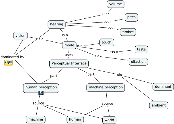 Study, human perception source world, hearing ???? timbre, mode is a hearing, hearing ???? pitch, human perception dominated by vision, mode is a vision, Perceptual Interface part machine perception, Perceptual Interface part human perception, mode is a taste, mode uses Perceptual Interface
