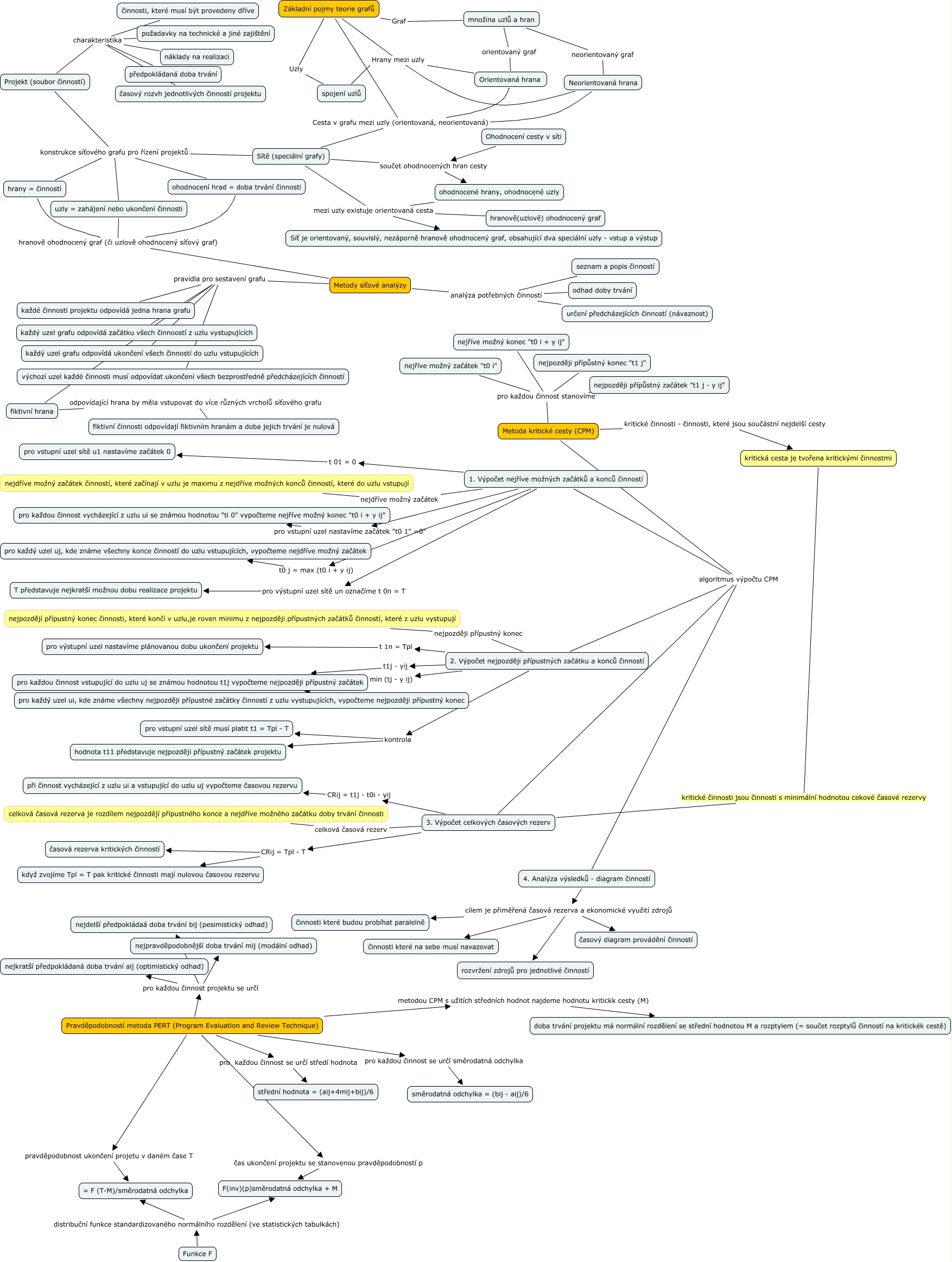 Řízení projektů - metody CPM a PERT, Základní pojmy teorie grafů Uzly spojení uzlů, ohodnocení hrad = doba trvání činnosti hranově ohodnocený graf (či uzlově ohodnocený síťový graf) Metody síťové analýzy, Ohodnocení cesty v síti součet ohodnocených hran cesty ohodnocené hrany, ohodnocené uzly, spojení uzlů Hrany mezi uzly Orientovaná hrana, 3. Výpočet celkových časových rezerv CRij = Tpl - T časová rezerva kritických činností, Základní pojmy teorie grafů Cesta v grafu mezi uzly (orientovaná, neorientovaná) Orientovaná hrana, 1. Výpočet nejříve možných začátků a konců činností t0 j = max (t0 i + y ij) pro každý uzel uj, kde známe všechny konce činností do uzlu vstupujících, vypočteme nejdříve možný začátek, Funkce F distribuční funkce standardizovaného normálního rozdělení (ve statistických tabulkách) F(inv)(p)směrodatná odchylka + M, Pravděpodobností metoda PERT (Program Evaluation and Review Technique) metodou CPM s užitích středních hodnot najdeme hodnotu kritickk cesty (M) doba trvání projektu má normální rozdělení se střední hodnotou M a rozptylem (= součet rozptylů činností na kritickék cestě), 3. Výpočet celkových časových rezerv CRij = t1j - t0i - yij při činnost vycházející z uzlu ui a vstupující do uzlu uj vypočteme časovou rezervu