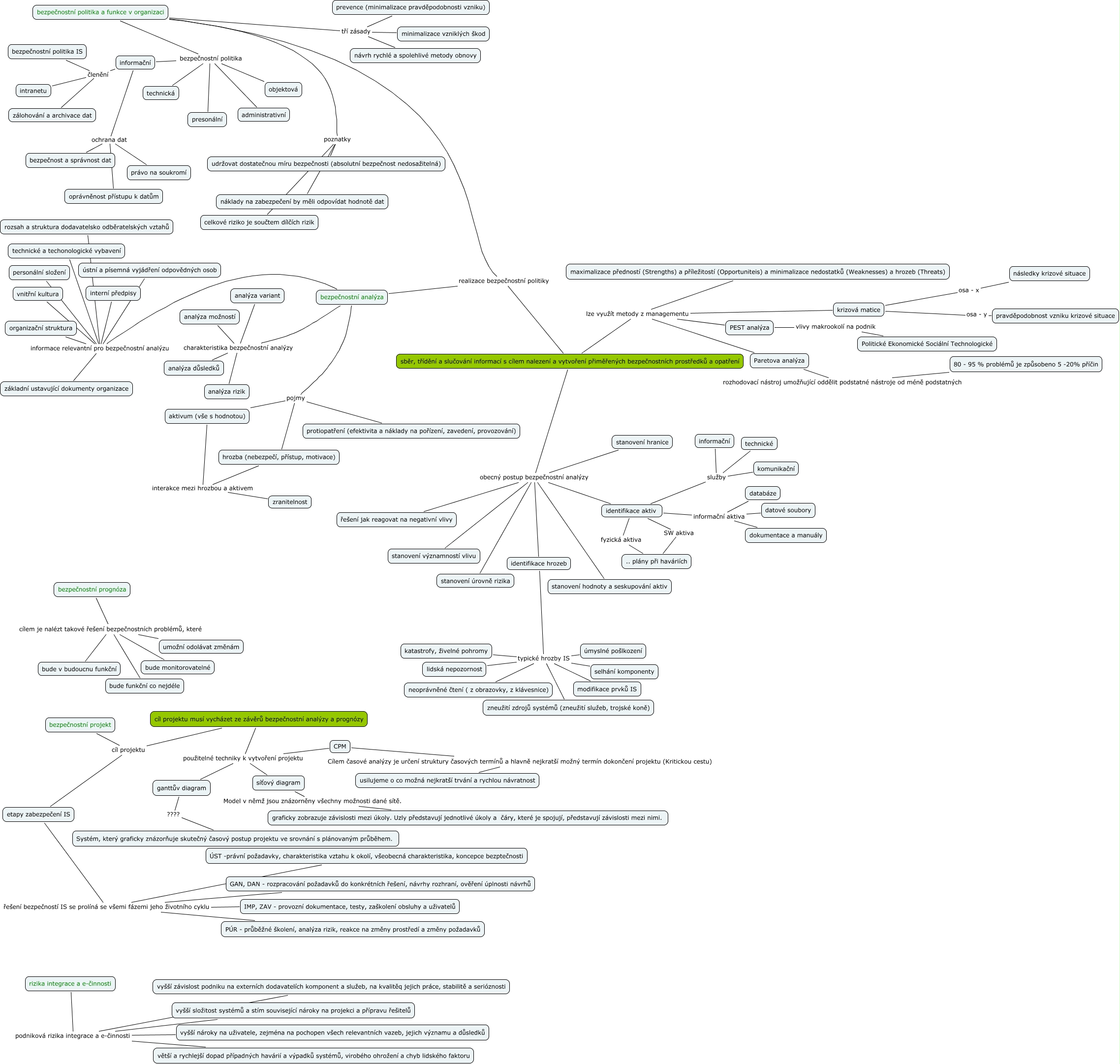 9. Koncepce ochrany informačního systému, sběr, třídění a slučování informací s cílem nalezení a vytvoření přiměřených bezpečnostních prostředků a opatření lze využít metody z managementu Paretova analýza, identifikace hrozeb typické hrozby IS katastrofy, živelné pohromy, CPM Cílem časové analýzy je určení struktury časových termínů a hlavně nejkratší možný termín dokončení projektu (Kritickou cestu) usilujeme o co možná nejkratší trvání a rychlou návratnost, sběr, třídění a slučování informací s cílem nalezení a vytvoření přiměřených bezpečnostních prostředků a opatření obecný postup bezpečnostní analýzy identifikace hrozeb, rizika integrace a e-činnosti podniková rizika integrace a e-činnosti vyšší nároky na uživatele, zejména na pochopen všech relevantních vazeb, jejich významu a důsledků, identifikace aktiv informační aktiva datové soubory, Paretova analýza rozhodovací nástroj umožňující oddělit podstatné nástroje od méně podstatných 80 - 95 % problémů je způsobeno 5 -20% příčin, sběr, třídění a slučování informací s cílem nalezení a vytvoření přiměřených bezpečnostních prostředků a opatření obecný postup bezpečnostní analýzy řešení jak reagovat na negativní vlivy, bezpečnostní analýza pojmy aktivum (vše s hodnotou), etapy zabezpečení IS řešení bezpečností IS se prolíná se všemi fázemi jeho životního cyklu PÚR - průběžné školení, analýza rizik, reakce na změny prostředí a změny požadavků