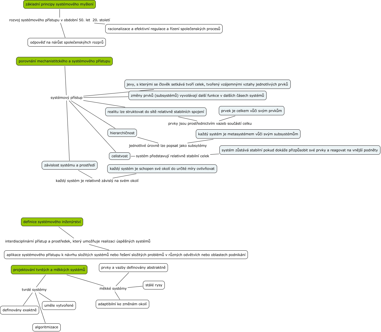 1. Systémové myšlení a systémové inženýrství, porovnání mechanistitckého a systémového přístupu systémový přístup jevy, s kterými se člověk setkává tvoří celek, tvořený vzájemnými vztahy jednotlivých prvků, závislost systému a prostředí každý systém je relativně závislý na svém okolí každý systém je schopen své okolí do určité míry ovlivňovat, realitu lze struktovat do sítě relativně stabilních spojení prvky jsou prostřednictvím vazeb součástí celku prvek je celkem vůči svým prvkům, porovnání mechanistitckého a systémového přístupu systémový přístup závislost systému a prostředí, definice systémového inženýrství interdisciplinární přístup a prostředek, který umožňuje realizaci úspěšných systémů aplikace systémového přístupu k návrhu složitých systémů nebo řešení složitých problémů v různých odvětvích nebo oblastech podnikání, projektování tvrdých a měkkých systémů tvrdé systémy definovány exaktně, projektování tvrdých a měkkých systémů měkké systémy adaptibilní ke změnám okolí, porovnání mechanistitckého a systémového přístupu systémový přístup celistvost, projektování tvrdých a měkkých systémů měkké systémy prvky a vazby definovány abstraktně, celistvost systém představují relativně stabilní celek systém zůstává stabilní pokud dokáže přizpůsobit své prvky a reagovat na vnější podněty