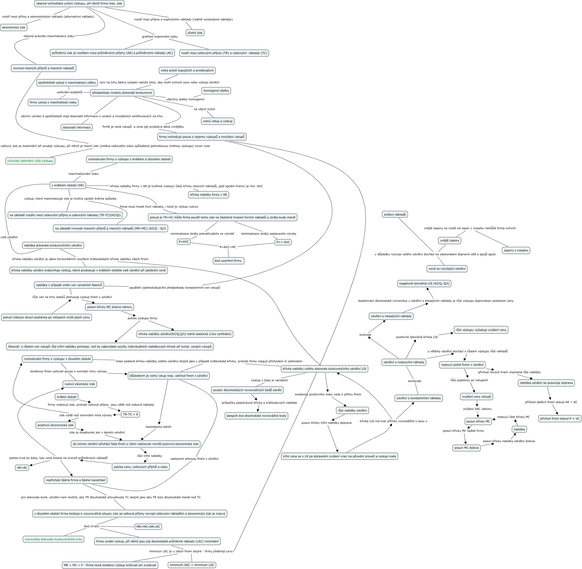 5. Chování firmy v dokonalé konkurenci, růst nabídky odvětví posun křivky tržní nabídky doprava tržní cena se v LR po dočasném zvýšení vrací na původní úroveň a výstup roste, rozhodování firmy o výstupu v dlouhém období nelze sestavit křivku nabídky celého odvětví stejně jako v případě krátkodobé křivky, protože firmy reagují příchodem či odchodem křivka nabídky celého dokonale konkurenčního odvětví LIS, obecná východiska určení výstupu, při němž firma max. zisk grafické znázornění zisku rozdíl mezi celkovými příjmy (TR) a celkovými náklady (TC), pokud je TR>VC může firma použít tento zisk na částečné hrazení fixních nákladů a ztráta bude menší minimalizace ztráty zastavením výroby P<= AVC, rozhodování firmy o výstupu v dlouhém období tendence firem usilovat pouze o normání míru výnosu důsledkem je volný vstup resp. odchod firem z odvětví, firma vyrábí výstup, při němž jsou její dlouhodobé průměrné náklady (LAC) minimální mininum LAC je u všech firem stejné - firmy přebírají cenu MR = MC = P - firma nená tendenci výstup snižovat ani zvyšovat, nepřichází žádná firma a žádná neodchází pro dokonale konk. odvětví není možné, aby TR dlouhodobě převyšovaly TC stejně jako aby TR byly dlouhodobě menší než TC v dlouhém období firma tenduje k rozvnovážné situaci, kdy se celkové příjmy rovnají celkovým nákladům a ekonomický zisk je nulový, P>AVC P=AVC=MC bod uzavření firmy, do tohoto odvětví přichází řada firem s cílem realizovat rovněž pozivvní ekonomický zisk růst tržní nabídky pokles ceny, celkových příjmů a zisku, nabídka v případě změn cen výrobních faktorů růst cen na trhu statků stimuluje výstup firem v odvětví posun křivky MC doleva nahoru