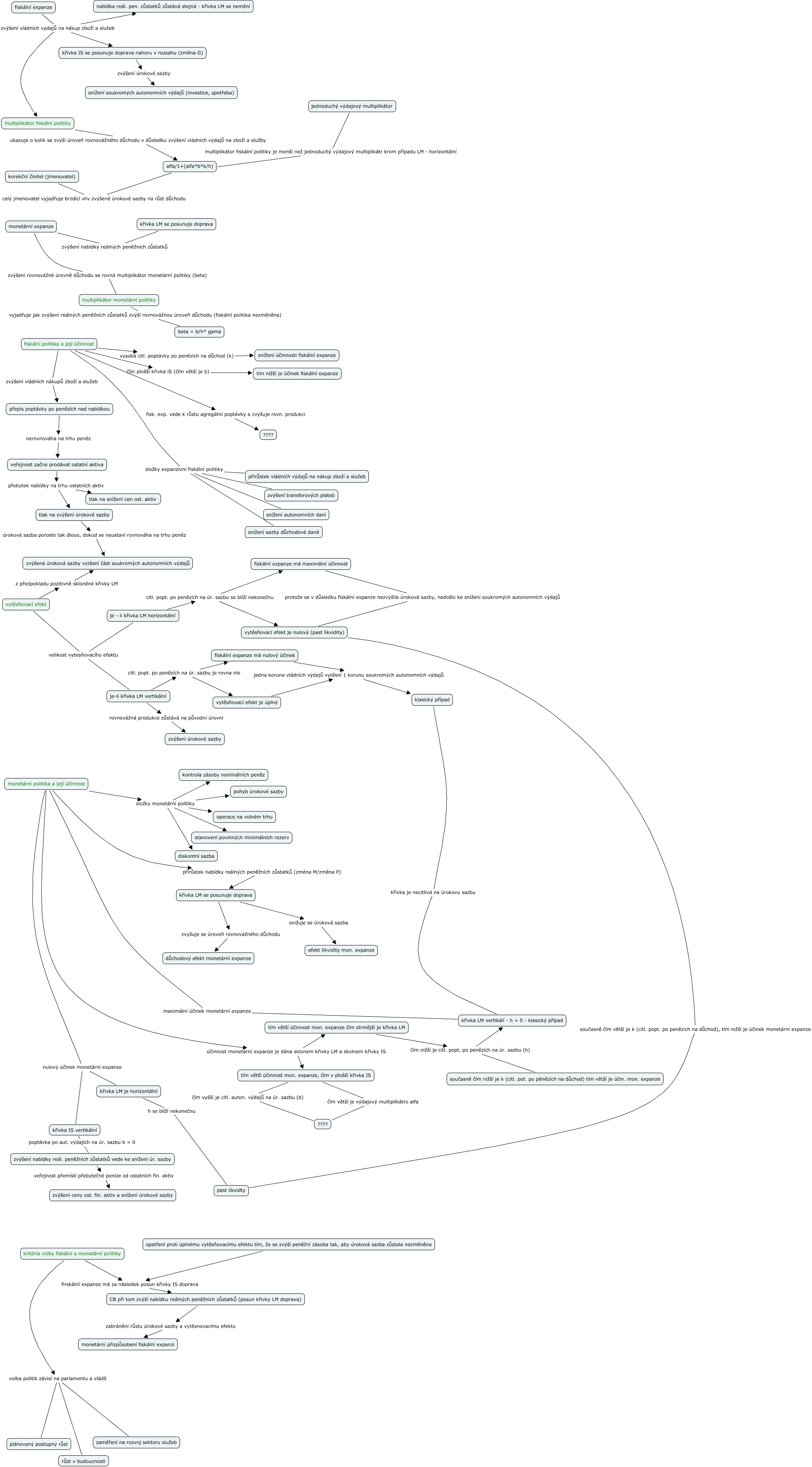 11. Fiskální a monetární politika, kritéria volby fiskální a monetární politiky volba politik závisí na parlamentu a vládě plánovaný postupný růst, monetární politika a její účinnost složky monetární politiky kontrola zásoby nominálních peněz, fiskální expanze zvýšení vládních výdajů na nákup zboží a služeb multiplikátor fiskální politiky, je - li křivka LM horizontální citl. popt. po penězích na úr. sazbu se blíží nekonečnu fiskální expanze má maximální účinnost, opatření proti úplnému vytěsňovacímu efektu tím, že se zvýší peněžní zásoba tak, aby úroková sazba zůstala nezměněna firskální expanze má za následek posun křivky IS doprava CB při tom zvýší nabídku reálných peněžních zůstatků (posun křivky LM doprava), veřejnost začne prodávat ostatní aktiva přebytek nabídky na trhu ostatních aktiv tlak na zvýšení úrokové sazby, tím větší účinnost mon. expanze čím strmější je křivka LM čím nižší je citl. popt. po penězích na úr. sazbu (h) současně čím nižší je k (citl. pot. po pěnězích na důchod) tím větší je účin. mon. expanze, fiskální politika a její účinnost fisk. exp. vede k růstu agregátní poptávky a zvyšuje rovn. produkci ????, přepis poptávky po penězích nad nabídkou nerovnováha na trhu peněz veřejnost začne prodávat ostatní aktiva, vytěsňovací efekt velikost vytesňovacího efektu je - li křivka LM horizontální
