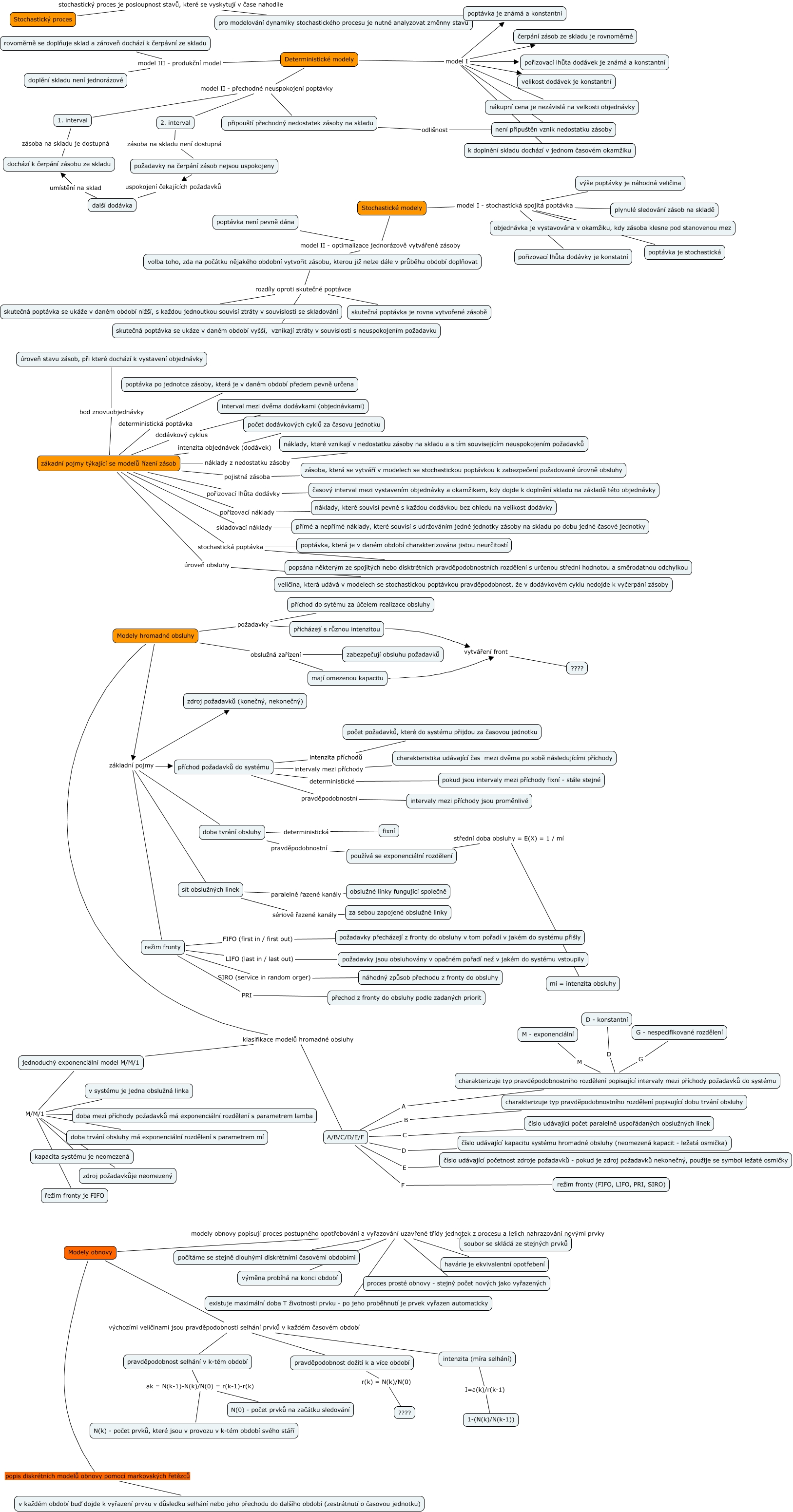 C - 1 Aplikace stochastických modelů, režim fronty SIRO (service in random orger) náhodný způsob přechodu z fronty do obsluhy, Modely hromadné obsluhy klasifikace modelů hromadné obsluhy A/B/C/D/E/F, zákadní pojmy týkající se modelů řízení zásob pořizovací náklady náklady, které souvisí pevně s každou dodávkou bez ohledu na velikost dodávky, Modely obnovy modely obnovy popisují proces postupného opotřebování a vyřazování uzavřené třídy jednotek z procesu a jejich nahrazování novými prvky soubor se skládá ze stejných prvků, sít obslužných linek paralelně řazené kanály obslužné linky fungující společně, Stochastické modely model I - stochastická spojitá poptávka plynulé sledování zásob na skladě, zákadní pojmy týkající se modelů řízení zásob bod znovuobjednávky úroveň stavu zásob, při které dochází k vystavení objednávky, volba toho, zda na počátku nějakého obdobní vytvořit zásobu, kterou již nelze dále v průběhu období doplňovat rozdíly oproti skutečné poptávce skutečná poptávka se ukáze v daném období vyšší, vznikají ztráty v souvislosti s neuspokojením požadavku, Modely obnovy výchozími veličinami jsou pravděpodobnosti selhání prvků v každém časovém období pravděpodobnost selhání v k-tém období, doba mezi příchody požadavků má exponenciální rozdělení s parametrem lamba M/M/1 řežim fronty je FIFO
