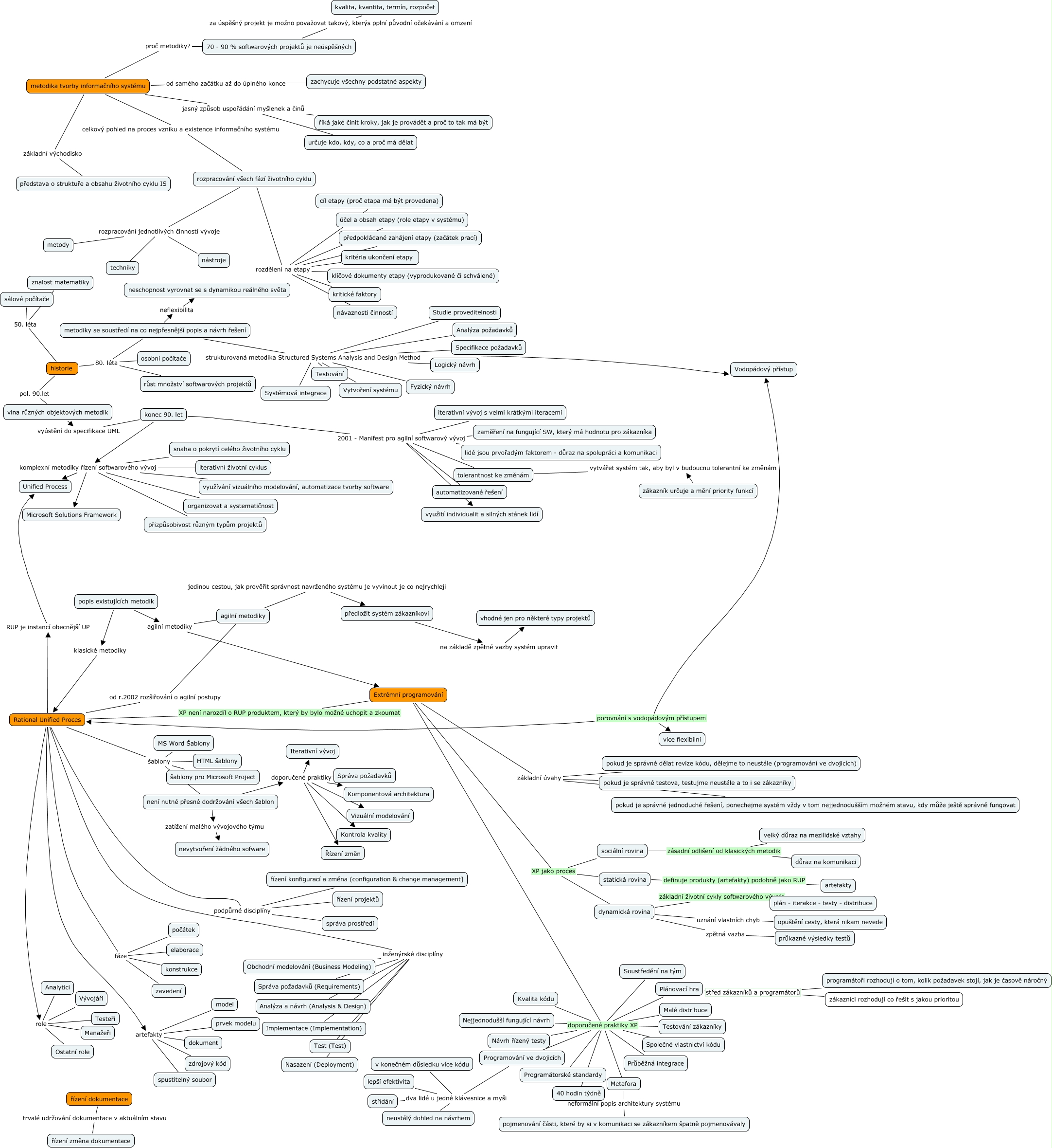 5. Metodiky projektování IS, není nutné přesné dodržování všech šablon doporučené praktiky Vizuální modelování, metodika tvorby informačního systému proč metodiky? 70 - 90 % softwarových projektů je neúspěšných, rozpracování všech fází životního cyklu rozdělení na etapy návaznosti činností, konec 90. let komplexní metodiky řízení softwarového vývoj Microsoft Solutions Framework, Extrémní programování doporučené praktiky XP Průběžná integrace, popis existujících metodik klasické metodiky Rational Unified Proces, konec 90. let komplexní metodiky řízení softwarového vývoj iterativní životní cyklus, Extrémní programování XP jako proces dynamická rovina, sociální rovina zásadní odlišení od klasických metodik důraz na komunikaci, konec 90. let komplexní metodiky řízení softwarového vývoj organizovat a systematičnost