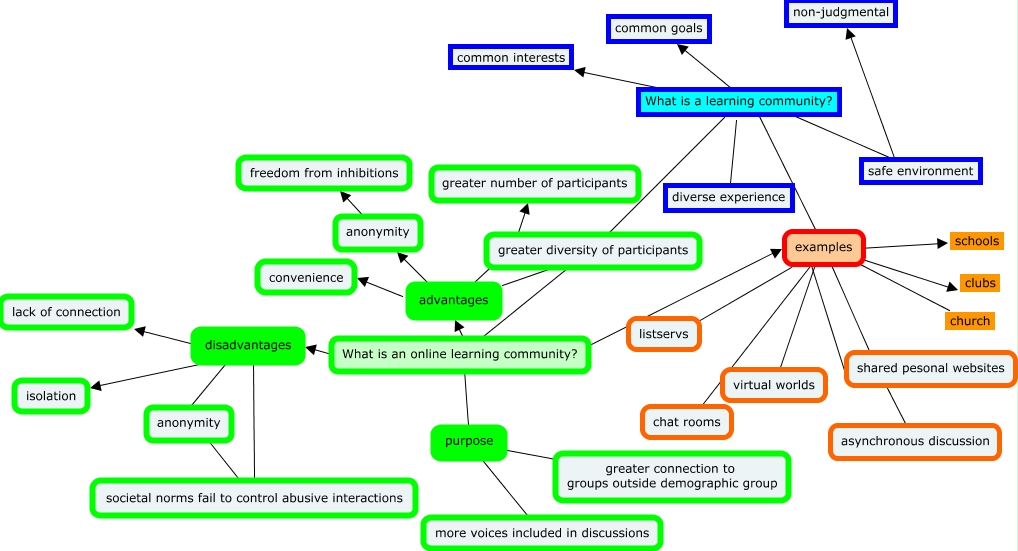 Pittenger_LearningCommunity, anonymity ???? societal norms fail to control abusive interactions, What is a learning community? ???? common goals, examples ???? clubs, What is an online learning community? ???? advantages, advantages ???? anonymity, examples ???? schools, disadvantages ???? societal norms fail to control abusive interactions, disadvantages ???? isolation, purpose ???? more voices included in discussions, What is an online learning community? ???? disadvantages