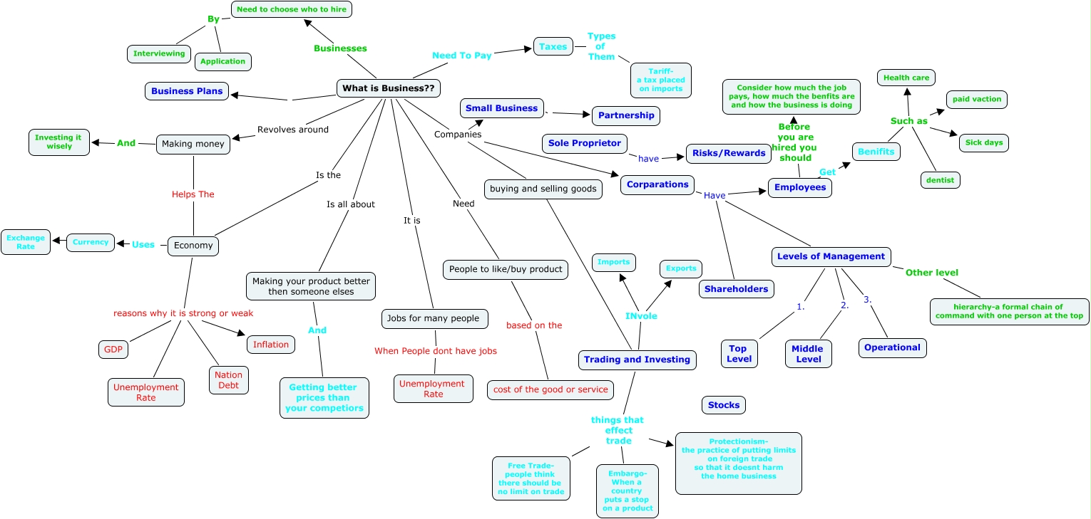 0508821, buying and selling goods Trading and Investing, Economy reasons why it is strong or weak GDP, Levels of Management 3. Operational, Need to choose who to hire By Interviewing, People to like/buy product based on the cost of the good or service, Benifits Such as Sick days, What is Business?? Companies Small Business, Taxes Types of Them Tariff- a tax placed on imports, What is Business?? It is Jobs for many people, Trading and Investing things that effect trade Embargo- When a country puts a stop on a product