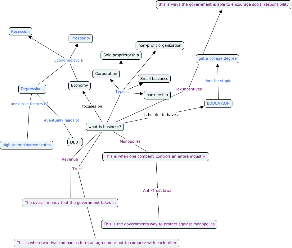 0361535, what is business? Types partnership, what is business? Types Corporation, This is when one company controls an entire industry. Anti-Trust laws This is the governments way to protect against monopolies, Economy Economic cycle Depressions, what is business? Revenue The overall money that the government takes in, Economy Economic cycle Recession, what is business? Types Small business, what is business? Trust This is when two rival companies form an agreement not to compete with each other, what is business? focuses on Economy, Depressions are direct factors of high unemployment rates