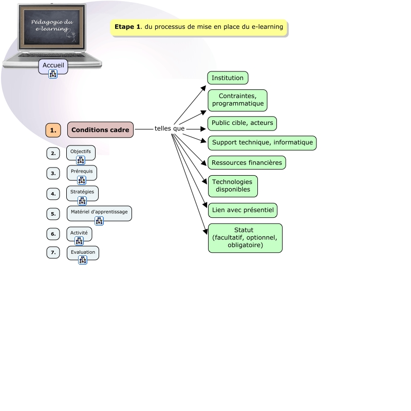 Conditions, Conditions cadre telles que Technologies disponibles, Conditions cadre telles que Statut (facultatif, optionnel, obligatoire), Conditions cadre telles que Lien avec présentiel, Conditions cadre telles que Institution, Conditions cadre telles que Ressources financières, Conditions cadre telles que Support technique, informatique, Conditions cadre telles que Contraintes, programmatique, Conditions cadre telles que Public cible, acteurs