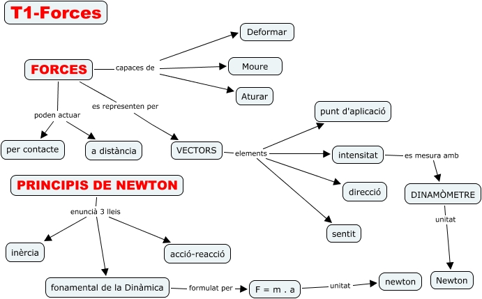 forces, FORCES capaces de Aturar, VECTORS elements intensitat, FORCES capaces de Deformar, fonamental de la Dinàmica formulat per F = m . a, DINAMÒMETRE unitat Newton, FORCES poden actuar per contacte, VECTORS elements sentit, F = m . a unitat newton, PRINCIPIS DE NEWTON enuncià 3 lleis fonamental de la Dinàmica, FORCES capaces de Moure