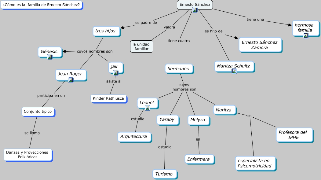 Mi Familia, Maritza es especialista en Psicomotricidad, Leonel estudia Arquitectura, tres hijos cuyos nombres son Génesis, Ernesto Sánchez es padre de tres hijos, hermanos cuyos nombres son Leonel, hermanos cuyos nombres son Yaraby, Jean Roger participa en un Conjunto típico, hermanos cuyos nombres son Melyza, tres hijos cuyos nombres son jair, Yaraby estudia Turismo