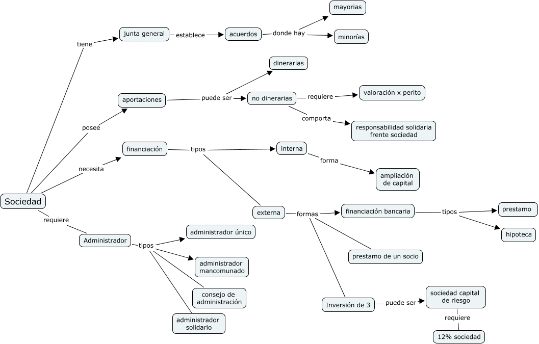 mapasociedad 2, no dinerarias comporta responsabilidad solidaria frente sociedad, Inversión de 3 puede ser sociedad capital de riesgo, junta general establece acuerdos, financiación bancaria tipos prestamo, Administrador tipos consejo de administración, externa formas prestamo de un socio, Sociedad necesita financiación, Sociedad tiene junta general, Administrador tipos administrador solidario, financiación bancaria tipos hipoteca