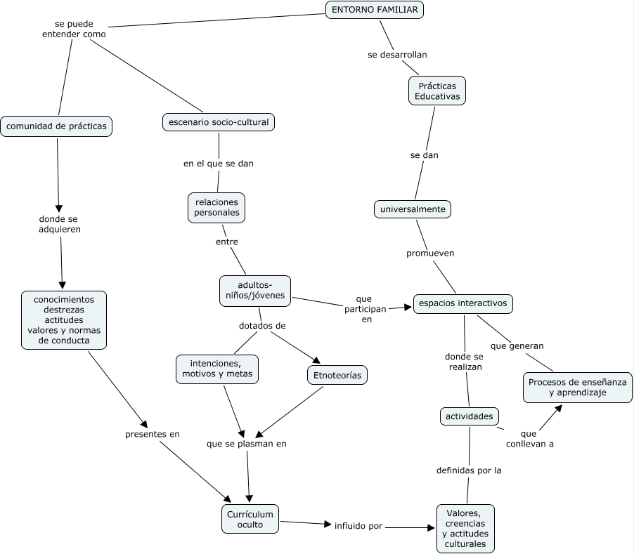 Escenario y curriculum familiar, adultos- niños/jóvenes que participan en espacios interactivos, intenciones, motivos y metas que se plasman en Currículum oculto, actividades definidas por la Valores, creencias y actitudes culturales, Currículum oculto influido por Valores, creencias y actitudes culturales, Prácticas Educativas se dan universalmente, actividades que conllevan a Procesos de enseñanza y aprendizaje, espacios interactivos que generan Procesos de enseñanza y aprendizaje, adultos- niños/jóvenes dotados de intenciones, motivos y metas, ENTORNO FAMILIAR se desarrollan Prácticas Educativas, ENTORNO FAMILIAR se puede entender como escenario socio-cultural