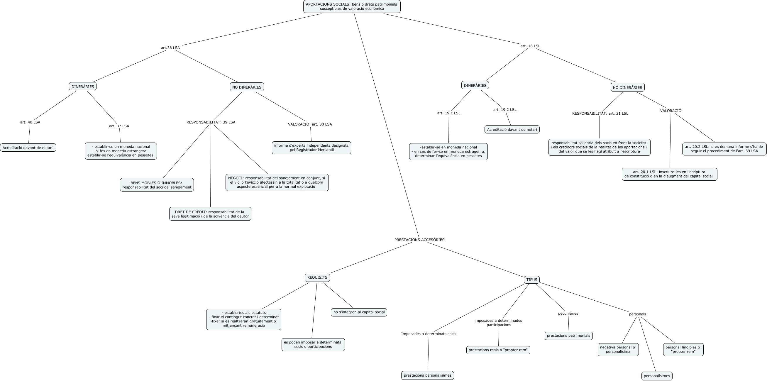 Mapa conceptual de la pràctica 2, TIPUS personals personalísimes, NO DINERÀRIES VALORACIÓ art. 20.2 LSL: si es demana informe s'ha de seguir el procediment de l'art. 39 LSA, DINERÀRIES art. 19.2 LSL Acreditació davant de notari, NO DINERÀRIES RESPONSABILITAT: 39 LSA NEGOCI: responsabilitat del sanejament en conjunt, si el vici o l'evicció afectessin a la totalitat o a quelcom aspecte essencial per a la normal explotació, DINERÀRIES art. 19.1 LSL -establir-se en moneda nacional - en cas de fer-se en moneda estragenra, determinar l'equivalència en pessetes, TIPUS imposades a determinades participacions prestacions reals o "propter rem", DINERÀRIES art. 40 LSA Acreditació davant de notari, APORTACIONS SOCIALS: béns o drets patrimonials susceptibles de valoració econòmica PRESTACIONS ACCESÒRIES REQUISITS, APORTACIONS SOCIALS: béns o drets patrimonials susceptibles de valoració econòmica art.36 LSA NO DINERÀRIES, NO DINERÀRIES VALORACIÓ art. 20.1 LSL: inscriure-les en l'ecriptura de constitució o en la d'augment del capital social