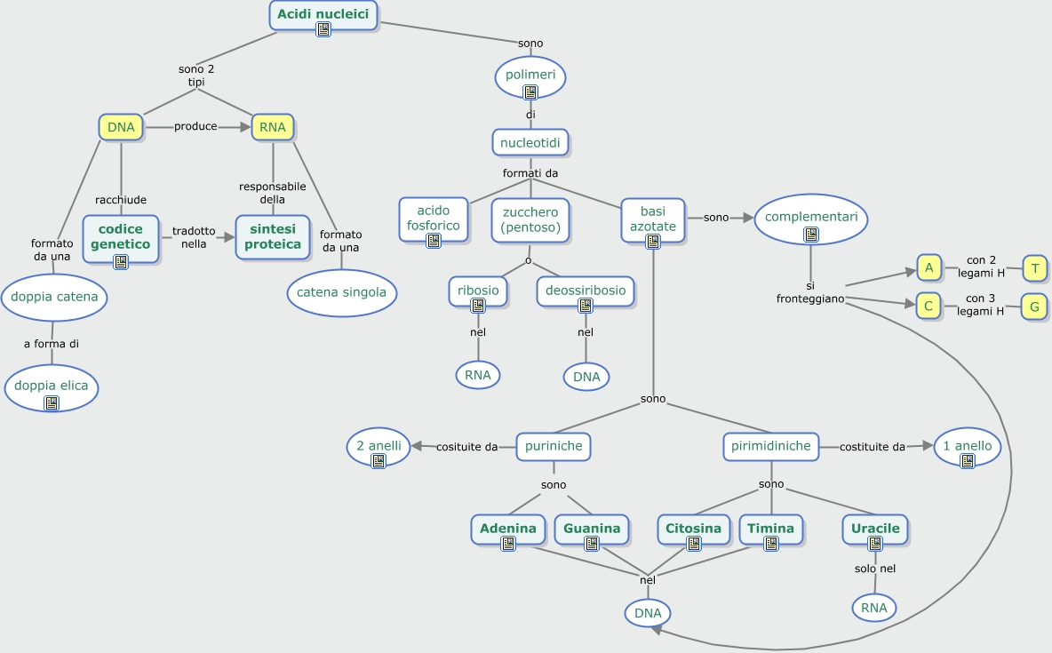 Questa Cmap, creata con IHMC CmapTools, contiene informazioni relative a: Acidi_nucleici, basi azotate sono complementari, puriniche sono Adenina, basi azotate sono puriniche, nucleotidi formati da acido fosforico, puriniche cosituite da 2 anelli, complementari si fronteggiano C, pirimidiniche sono Uracile, doppia catena a forma di doppia elica, ribosio nel RNA, deossiribosio nel DNA, complementari si fronteggiano A, Uracile solo nel RNA, complementari si fronteggiano DNA, zucchero (pentoso) o ribosio, pirimidiniche costituite da 1 anello, RNA formato da una catena singola, zucchero (pentoso) o deossiribosio, Citosina nel DNA, polimeri di nucleotidi, Acidi nucleici sono 2 tipi DNA