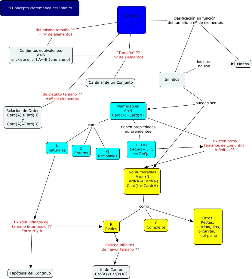 Introducción al Infinito, No numerables A no ≈N Card(A)≠Card(N) Card(N)≤Card(A) como R Reales, 1+1=1 1+1+1+..=1 N≈Z≈Q.. Existen otros tamaños de conjuntos infinitos ?? No numerables A no ≈N Card(A)≠Card(N) Card(N)≤Card(A), Numerables A≈N Card(A)=Card(N) como Z Enteros, Conjunto C "Tamaño" ?? nº de elementos Cardinal de un Conjunto, Conjunto C clasificación en función del tamaño o nº de elementos Finitos, Conjuntos equivalentes A≈B si existe una f:A↔B (uno a uno) "Tamaño" ?? nº de elementos Cardinal de un Conjunto, Conjunto C de distinto tamaño ?? ≠nº de elementos Relación de Orden Card(A)≤Card(B) y Card(A)≠Card(B), Conjunto C clasificación en función del tamaño o nº de elementos Infinitos, Numerables A≈N Card(A)=Card(N) como Q Racionales, Infinitos pueden ser No numerables A no ≈N Card(A)≠Card(N) Card(N)≤Card(A)