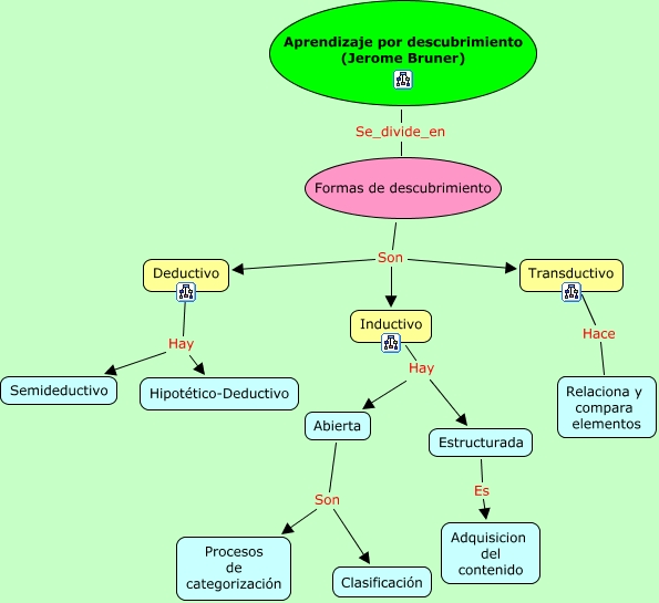 Formas de descubrimiento, Inductivo Hay Estructurada, Formas de descubrimiento Son Inductivo, Estructurada Es Adquisicion del contenido, Deductivo Hay Semideductivo, Inductivo Hay Abierta, Abierta Son Procesos de categorización, Aprendizaje por descubrimiento (Jerome Bruner) Se_divide_en Formas de descubrimiento, Deductivo Hay Hipotético-Deductivo, Transductivo Hace Relaciona y compara elementos, Formas de descubrimiento Son Deductivo
