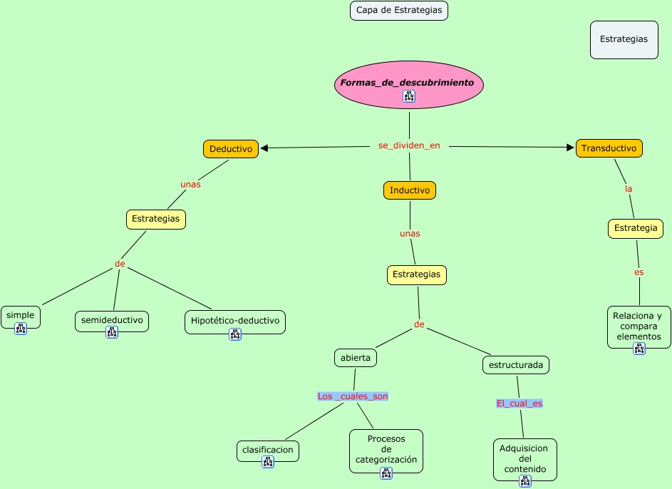 EStrategias, abierta Los _cuales_son Procesos de categorización, Estrategias de simple, Estrategias de Hipotético-deductivo, Estrategias de semideductivo, abierta Los _cuales_son clasificacion, estructurada El_cual_es Adquisicion del contenido, Formas_de_descubrimiento se_dividen_en Transductivo, Estrategia es Relaciona y compara elementos, Estrategias de estructurada, Formas_de_descubrimiento se_dividen_en Inductivo