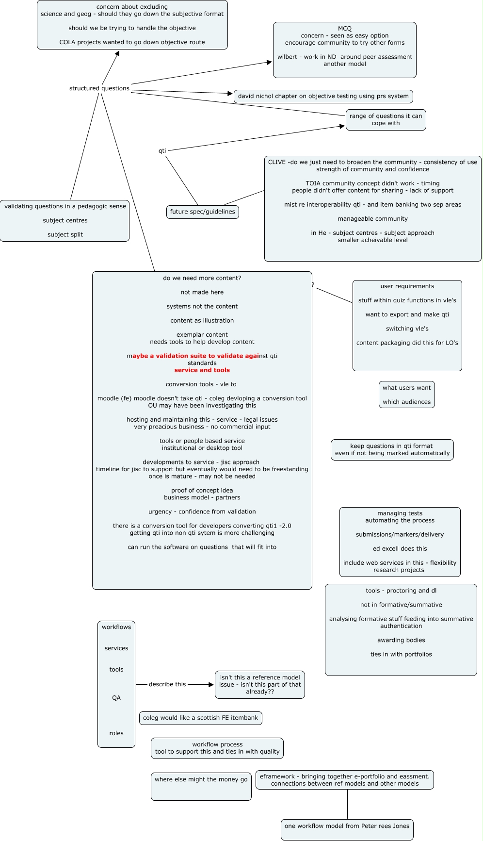 future spec, workflows services tools QA roles describe this isn't this a reference model issue - isn't this part of that already??, range of questions it can cope with structured questions david nichol chapter on objective testing using prs system, future spec/guidelines qti range of questions it can cope with, range of questions it can cope with structured questions concern about excluding science and geog - should they go down the subjective format should we be trying to handle the objective COLA projects wanted to go down objective route, future spec/guidelines ???? CLIVE -do we just need to broaden the community - consistency of use strength of community and confidence TOIA community concept didn't work - timing people didn't offer content for sharing - lack of support mist re interoperability qti - and item banking two sep areas manageable community in He - subject centres - subject approach smaller acheivable level, range of questions it can cope with structured questions MCQ concern - seen as easy option encourage community to try other forms wilbert - work in ND around peer assessment another model, range of questions it can cope with structured questions validating questions in a pedagogic sense subject centres subject split, eframework - bringing together e-portfolio and eassment. connections between ref models and other models ???? one workflow model from Peter rees Jones, range of questions it can cope with structured questions do we need more content? not made here systems not the content content as illustration exemplar content needs tools to help develop content maybe a validation suite to validate against qti standards service and tools conversion tools - vle to moodle (fe) moodle doesn't take qti - coleg devloping a conversion tool OU may have been investigating this hosting and maintaining this - service - legal issues very preacious business - no commercial input tools or people based service institutional or desktop tool developments to service - jisc approach timeline for jisc to support but eventually would need to be freestanding once is mature - may not be needed proof of concept idea business model - partners urgency - confidence from validation there is a conversion tool for developers converting qti1 -2.0 getting qti into non qti sytem is more challenging can run the software on questions that will fit into, user requirements stuff within quiz functions in vle's want to export and make qti switching vle's content packaging did this for LO's ???? do we need more content? not made here systems not the content content as illustration exemplar content needs tools to help develop content maybe a validation suite to validate against qti standards service and tools conversion tools - vle to moodle (fe) moodle doesn't take qti - coleg devloping a conversion tool OU may have been investigating this hosting and maintaining this - service - legal issues very preacious business - no commercial input tools or people based service institutional or desktop tool developments to service - jisc approach timeline for jisc to support but eventually would need to be freestanding once is mature - may not be needed proof of concept idea business model - partners urgency - confidence from validation there is a conversion tool for developers converting qti1 -2.0 getting qti into non qti sytem is more challenging can run the software on questions that will fit into
