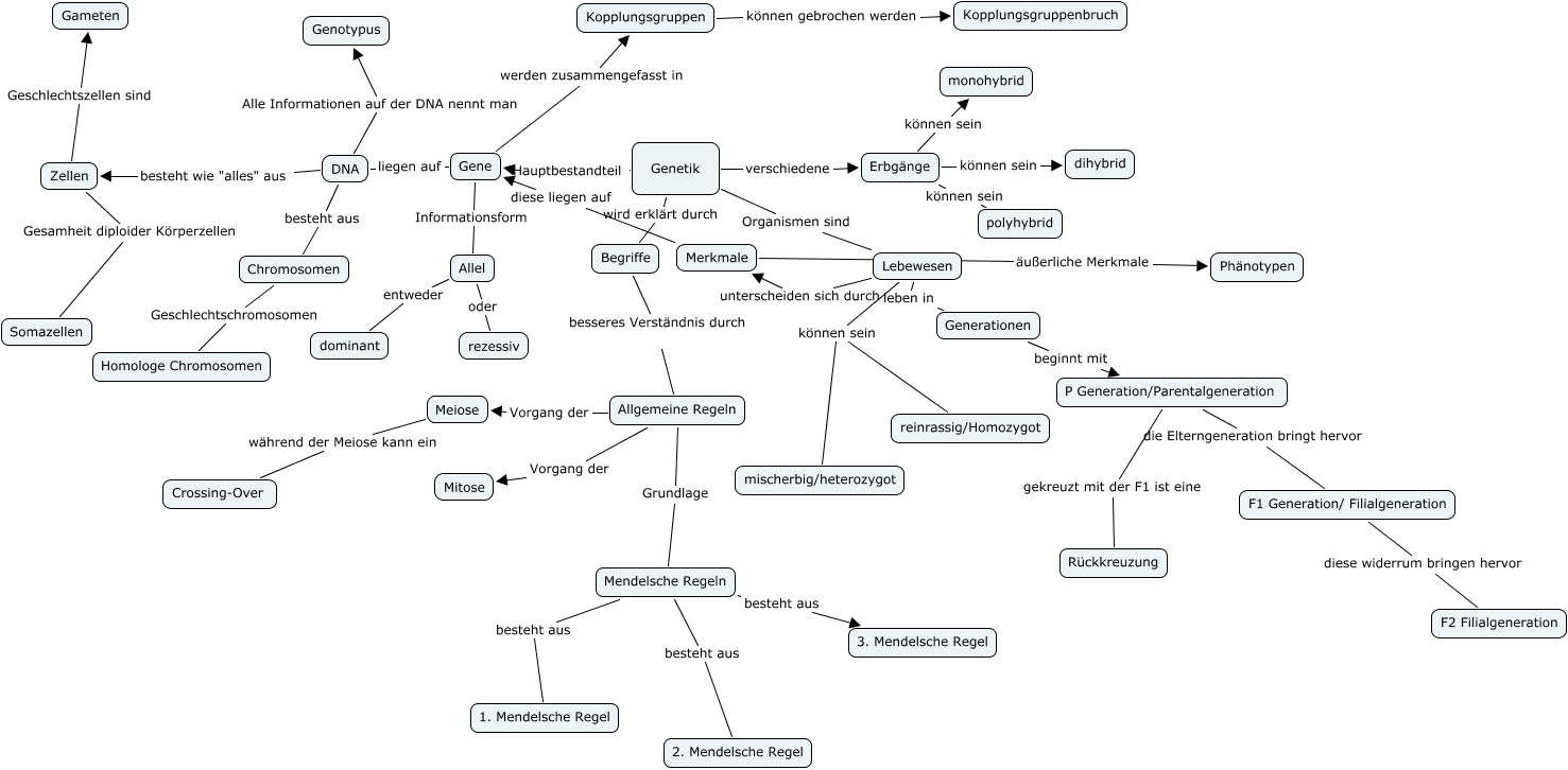 Timo anfang1, Gene Informationsform Allel, Merkmale äußerliche Merkmale Phänotypen, DNA besteht aus Chromosomen, Lebewesen leben in Generationen, Generationen beginnt mit P Generation/Parentalgeneration, Mendelsche Regeln besteht aus 1. Mendelsche Regel, Genetik verschiedene Erbgänge, Allgemeine Regeln Grundlage Mendelsche Regeln, Gene werden zusammengefasst in Kopplungsgruppen, Lebewesen können sein mischerbig/heterozygot
