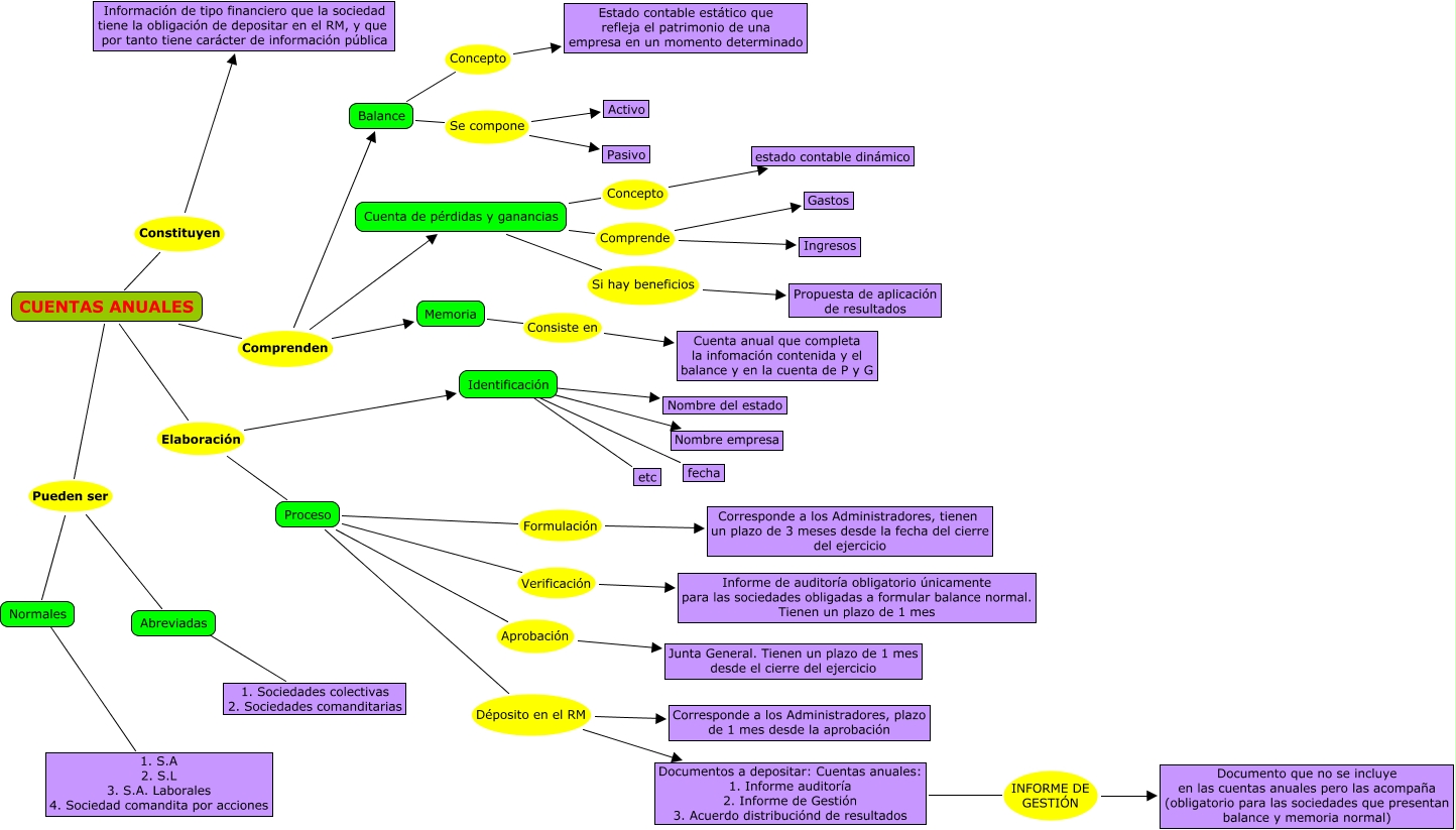 mapa problema nº 4 Passem comptes Jessica Herrera, Cuenta de pérdidas y ganancias Comprende Ingresos, Identificación ???? etc, Memoria Consiste en Cuenta anual que completa la infomación contenida y el balance y en la cuenta de P y G, Balance Concepto Estado contable estático que refleja el patrimonio de una empresa en un momento determinado, Cuenta de pérdidas y ganancias Comprende Gastos, Balance Se compone Pasivo, Proceso Déposito en el RM Documentos a depositar: Cuentas anuales: 1. Informe auditoría 2. Informe de Gestión 3. Acuerdo distribuciónd de resultados, Cuenta de pérdidas y ganancias Concepto estado contable dinámico, Identificación ???? Nombre del estado, Abreviadas ???? 1. Sociedades colectivas 2. Sociedades comanditarias