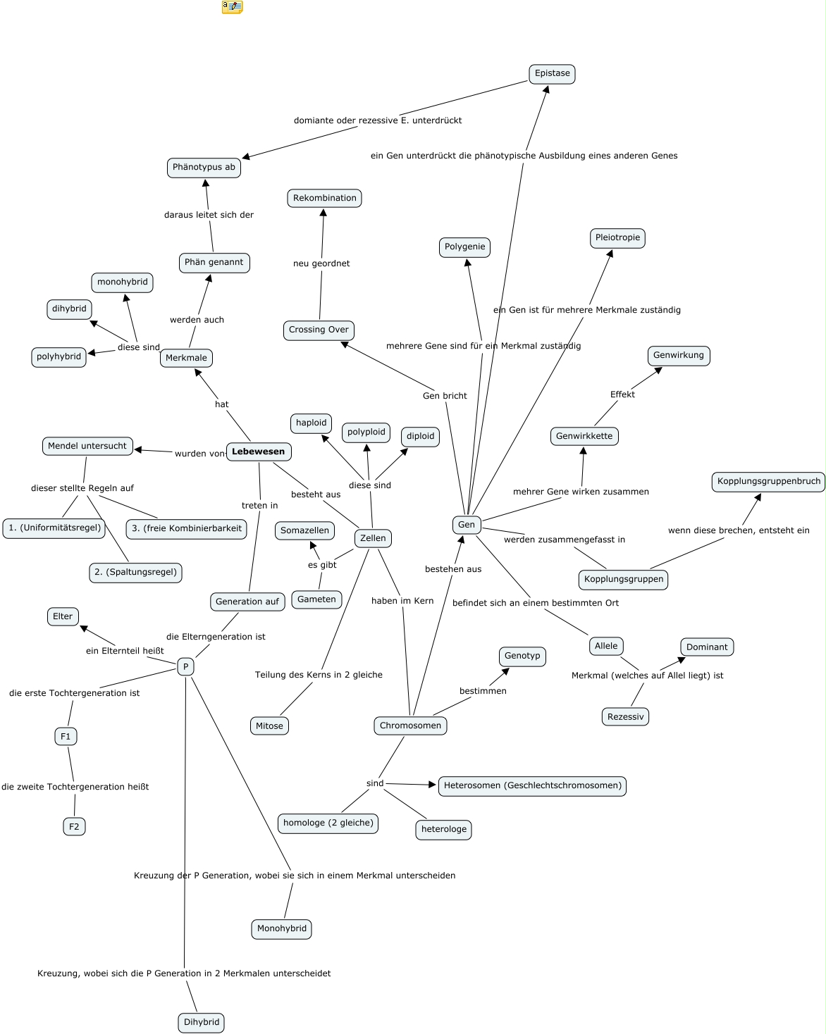 Genetik von Alina, Merkmale diese sind dihybrid, P Kreuzung der P Generation, wobei sie sich in einem Merkmal unterscheiden Monohybrid, Mendel untersucht dieser stellte Regeln auf 2. (Spaltungsregel), Merkmale werden auch Phän genannt, P Kreuzung, wobei sich die P Generation in 2 Merkmalen unterscheidet Dihybrid, Generation auf die Elterngeneration ist P, Zellen es gibt Gameten, Lebewesen besteht aus Zellen, Chromosomen sind heterologe, Kopplungsgruppen wenn diese brechen, entsteht ein Kopplungsgruppenbruch