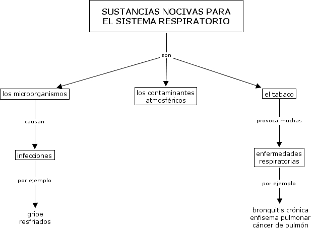Sustancias nocivas, infecciones por ejemplo gripe resfriados, los microorganismos causan infecciones, SUSTANCIAS NOCIVAS PARA EL SISTEMA RESPIRATORIO son los microorganismos, SUSTANCIAS NOCIVAS PARA EL SISTEMA RESPIRATORIO son los contaminantes atmosféricos, enfermedades respiratorias por ejemplo bronquitis crónica enfisema pulmonar cáncer de pulmón, el tabaco provoca muchas enfermedades respiratorias, SUSTANCIAS NOCIVAS PARA EL SISTEMA RESPIRATORIO son el tabaco