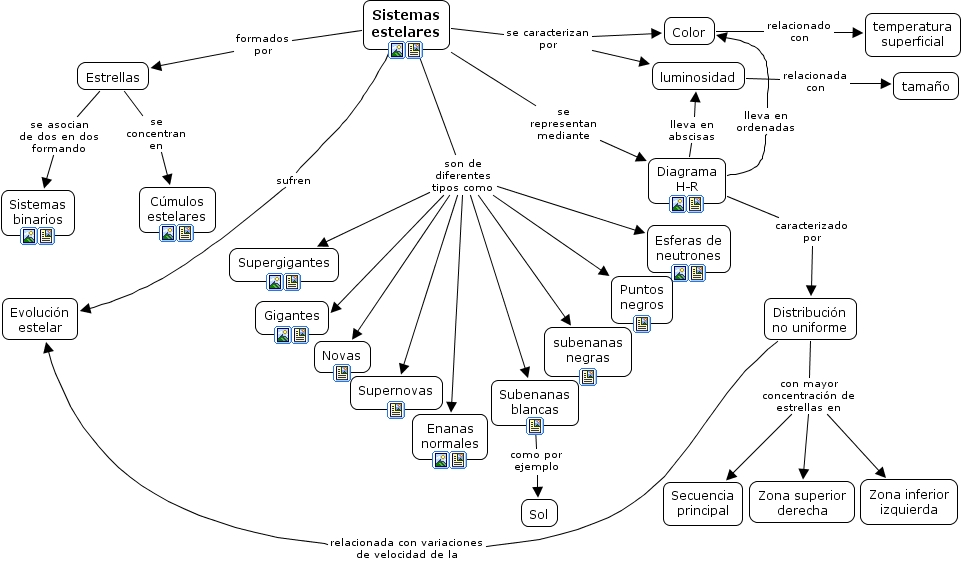 Sistemas estelares, Sistemas estelares son de diferentes tipos como Subenanas blancas, Estrellas se concentran en Cúmulos estelares, Distribución no uniforme relacionada con variaciones de velocidad de la Evolución estelar, Diagrama H-R lleva en ordenadas Color, Diagrama H-R caracterizado por Distribución no uniforme, Sistemas estelares se caracterizan por luminosidad, Distribución no uniforme con mayor concentración de estrellas en Zona inferior izquierda, Sistemas estelares son de diferentes tipos como Supernovas, Sistemas estelares sufren Evolución estelar, Distribución no uniforme con mayor concentración de estrellas en Zona superior derecha