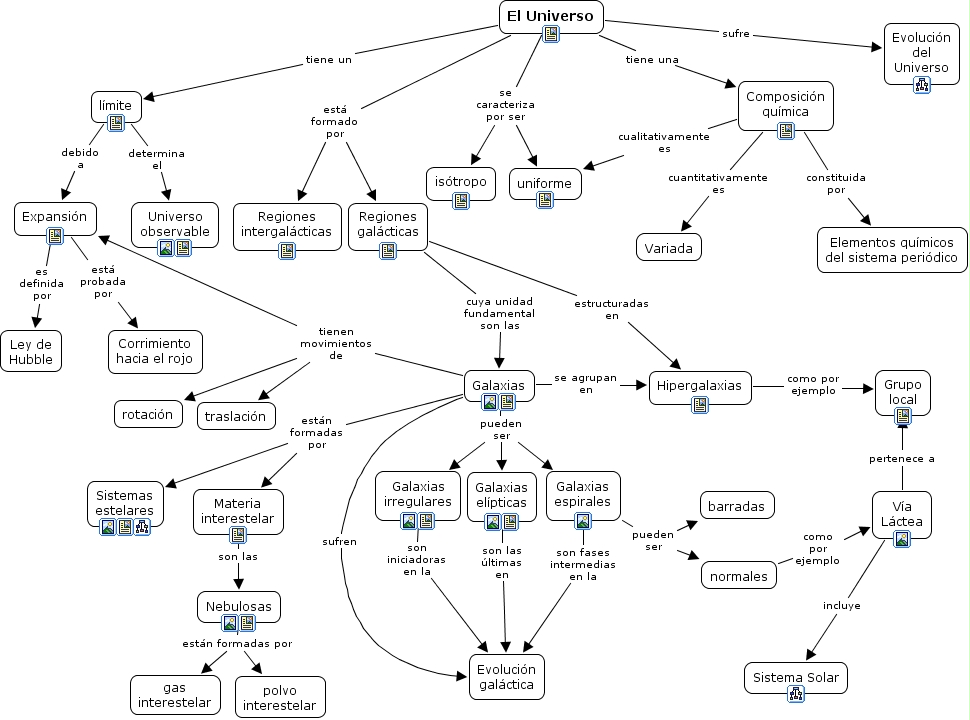 UNIVERSO, Nebulosas están formadas por polvo interestelar, límite determina el Universo observable, Galaxias espirales pueden ser normales, El Universo tiene una Composición química, Galaxias pueden ser Galaxias irregulares, El Universo está formado por Regiones intergalácticas, El Universo sufre Evolución del Universo, Galaxias están formadas por Sistemas estelares, Composición química cuantitativamente es Variada, Galaxias están formadas por Materia interestelar