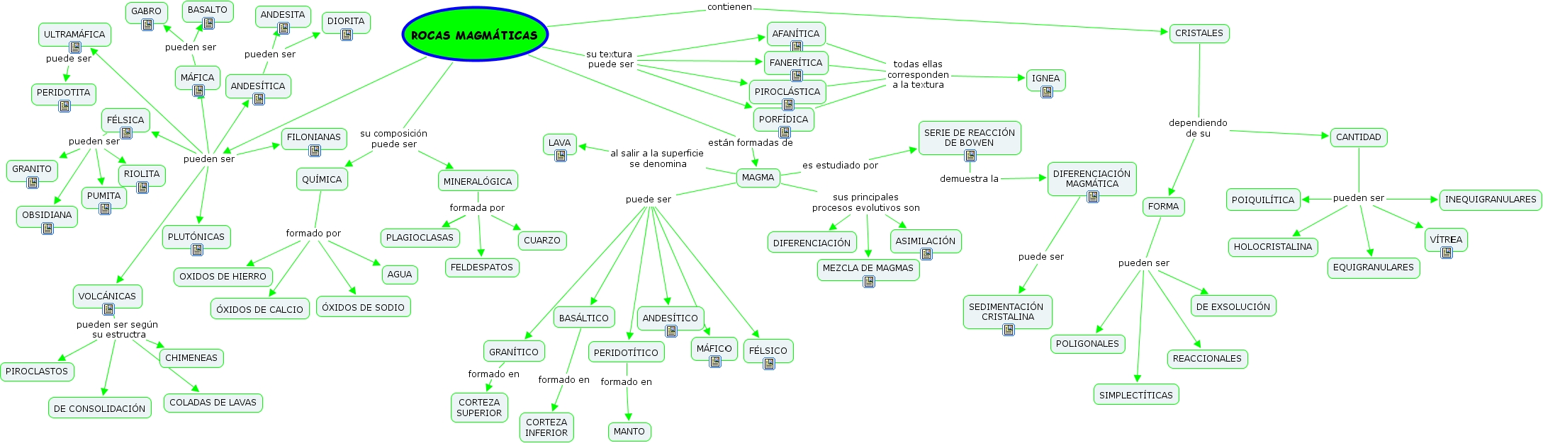 FANER�TICA todas ellas corresponden a la textura IGNEA, VOLC�NICAS pueden ser seg�n su estructra COLADAS DE LAVAS, VOLC�NICAS pueden ser seg�n su estructra CHIMENEAS, VOLC�NICAS pueden ser seg�n su estructra DE CONSOLIDACI�N, VOLC�NICAS pueden ser seg�n su estructra PIROCLASTOS, SERIE DE REACCI�N DE BOWEN demuestra la DIFERENCIACI�N MAGM�TICA, PIROCL�STICA todas ellas corresponden a la textura IGNEA, FORMA pueden ser REACCIONALES, FORMA pueden ser POLIGONALES, FORMA pueden ser DE EXSOLUCI�N, FORMA pueden ser SIMPLECT�TICAS, ROCAS MAGM�TICAS est�n formadas de MAGMA, CANTIDAD pueden ser HOLOCRISTALINA, CANTIDAD pueden ser INEQUIGRANULARES, CANTIDAD pueden ser V�TREA, CANTIDAD pueden ser EQUIGRANULARES, CANTIDAD pueden ser POIQUIL�TICA, F�LSICA pueden ser GRANITO, F�LSICA pueden ser RIOLITA, F�LSICA pueden ser OBSIDIANA, F�LSICA pueden ser PUMITA, MAGMA es estudiado por SERIE DE REACCI�N DE BOWEN, ROCAS MAGM�TICAS contienen CRISTALES, M�FICA pueden ser BASALTO, M�FICA pueden ser GABRO, ANDES�TICA pueden ser DIORITA, ANDES�TICA pueden ser ANDESITA, ROCAS MAGM�TICAS su composici�n puede ser MINERAL�GICA, ROCAS MAGM�TICAS su composici�n puede ser QU�MICA, ROCAS MAGM�TICAS su textura puede ser PIROCL�STICA, ROCAS MAGM�TICAS su textura puede ser FANER�TICA, ROCAS MAGM�TICAS su textura puede ser PORF�DICA, ROCAS MAGM�TICAS su textura puede ser AFAN�TICA, DIFERENCIACI�N MAGM�TICA puede ser SEDIMENTACI�N CRISTALINA, CRISTALES dependiendo de su FORMA, CRISTALES dependiendo de su CANTIDAD, QU�MICA formado por �XIDOS DE SODIO, QU�MICA formado por OXIDOS DE HIERRO, QU�MICA formado por AGUA, QU�MICA formado por �XIDOS DE CALCIO, MAGMA al salir a la superficie se denomina LAVA, PERIDOT�TICO formado en MANTO, ULTRAM�FICA puede ser PERIDOTITA, GRAN�TICO formado en CORTEZA SUPERIOR, MAGMA sus principales procesos evolutivos son MEZCLA DE MAGMAS, MAGMA sus principales procesos evolutivos son ASIMILACI�N, MAGMA sus principales procesos evolutivos son DIFERENCIACI�N, ROCAS MAGM�TICAS pueden ser VOLC�NICAS, ROCAS MAGM�TICAS pueden ser FILONIANAS, ROCAS MAGM�TICAS pueden ser ANDES�TICA, ROCAS MAGM�TICAS pueden ser PLUT�NICAS, ROCAS MAGM�TICAS pueden ser ULTRAM�FICA, ROCAS MAGM�TICAS pueden ser M�FICA, ROCAS MAGM�TICAS pueden ser F�LSICA, BAS�LTICO formado en CORTEZA INFERIOR, PORF�DICA todas ellas corresponden a la textura IGNEA, MAGMA puede ser BAS�LTICO, MAGMA puede ser ANDES�TICO, MAGMA puede ser F�LSICO, MAGMA puede ser M�FICO, MAGMA puede ser PERIDOT�TICO, MAGMA puede ser GRAN�TICO, MINERAL�GICA formada por PLAGIOCLASAS, MINERAL�GICA formada por CUARZO, MINERAL�GICA formada por FELDESPATOS, MINERAL�GICA formada por PLAGIOCLASAS, AFAN�TICA todas ellas corresponden a la textura IGNEA