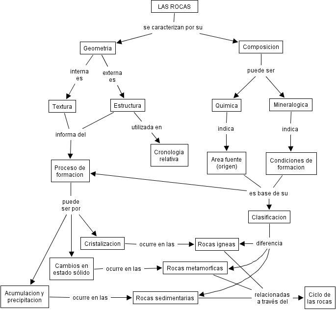 Rocas, Clasificacion diferencia Rocas sedimentarias, Quimica indica Area fuente (origen), Proceso de formacion puede ser por Cristalizacion, Geometria externa es Estructura, Estructura informa del Proceso de formacion, LAS ROCAS se caracterizan por su Geometria, Clasificacion diferencia Rocas metamorficas, Composicion puede ser Quimica, Composicion puede ser Mineralogica, Area fuente (origen) es base de su Proceso de formacion
