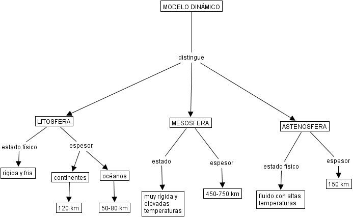 Modelo dinámico, MESOSFERA estado muy rígida y elevadas temperaturas, ASTENOSFERA estado físico fluido con altas temperaturas, continentes ???? 120 km, océanos ???? 50-80 km, LITOSFERA espesor continentes, MODELO DINÁMICO distingue ASTENOSFERA, MODELO DINÁMICO distingue LITOSFERA, LITOSFERA espesor océanos, ASTENOSFERA espesor 150 km, MESOSFERA espesor 450-750 km