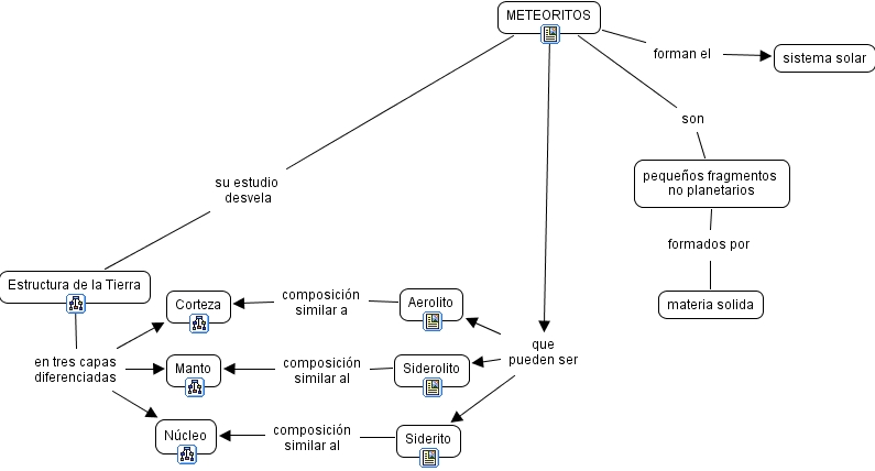 METEORITOS son peque�os fragmentos no planetarios, Siderolito composici�n similar al Manto, Siderito composici�n similar al N�cleo, Aerolito composici�n similar a Corteza, METEORITOS forman el sistema solar, Estructura de la Tierra en tres capas diferenciadas Manto, Estructura de la Tierra en tres capas diferenciadas N�cleo, Estructura de la Tierra en tres capas diferenciadas Corteza, METEORITOS que pueden ser Siderolito, METEORITOS que pueden ser Siderito, METEORITOS que pueden ser Aerolito, peque�os fragmentos no planetarios formados por materia solida, METEORITOS su estudio desvela Estructura de la Tierra