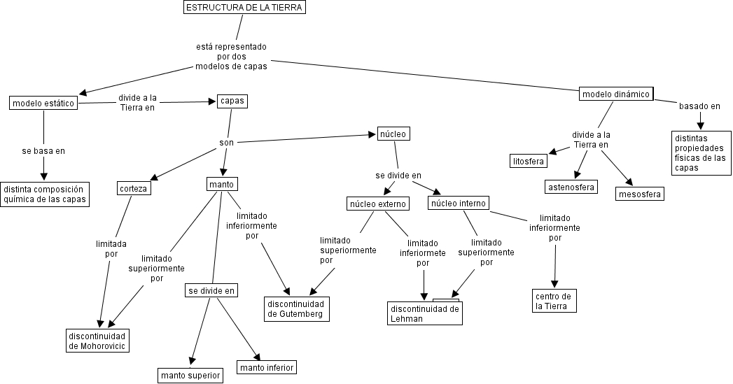 Estructura de la Tierra, ESTRUCTURA DE LA TIERRA está representado por dos modelos de capas modelo estático, modelo dinámico divide a la Tierra en mesosfera, núcleo interno limitado superiormente por ????, modelo dinámico divide a la Tierra en astenosfera, manto ???? se divide en, núcleo externo ???? limitado superiormente por, núcleo interno limitado inferiormente por centro de la Tierra, modelo estático se basa en distinta composición química de las capas, modelo dinámico divide a la Tierra en litosfera, ESTRUCTURA DE LA TIERRA está representado por dos modelos de capas ????