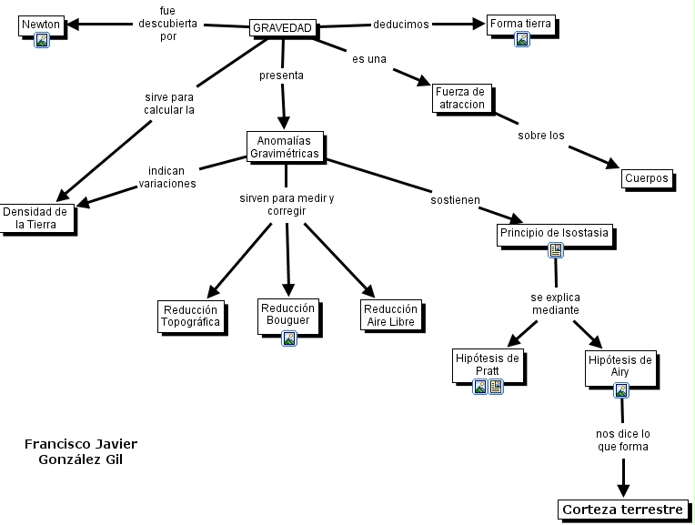 Anomal�as Gravim�tricas indican variaciones Densidad de la Tierra, Principio de Isostasia se explica mediante Hip�tesis de Pratt, Principio de Isostasia se explica mediante Hip�tesis de Airy, GRAVEDAD presenta Anomal�as Gravim�tricas, GRAVEDAD fue descubierta por Newton, Anomal�as Gravim�tricas sostienen Principio de Isostasia, Hip�tesis de Airy nos dice lo que forma Corteza terrestre, Fuerza de atraccion sobre los Cuerpos, GRAVEDAD deducimos Forma tierra, Anomal�as Gravim�tricas sirven para medir y corregir Reducci�n Topogr�fica, Anomal�as Gravim�tricas sirven para medir y corregir Reducci�n Aire Libre, Anomal�as Gravim�tricas sirven para medir y corregir Reducci�n Bouguer, GRAVEDAD es una Fuerza de atraccion, GRAVEDAD sirve para calcular la Densidad de la Tierra