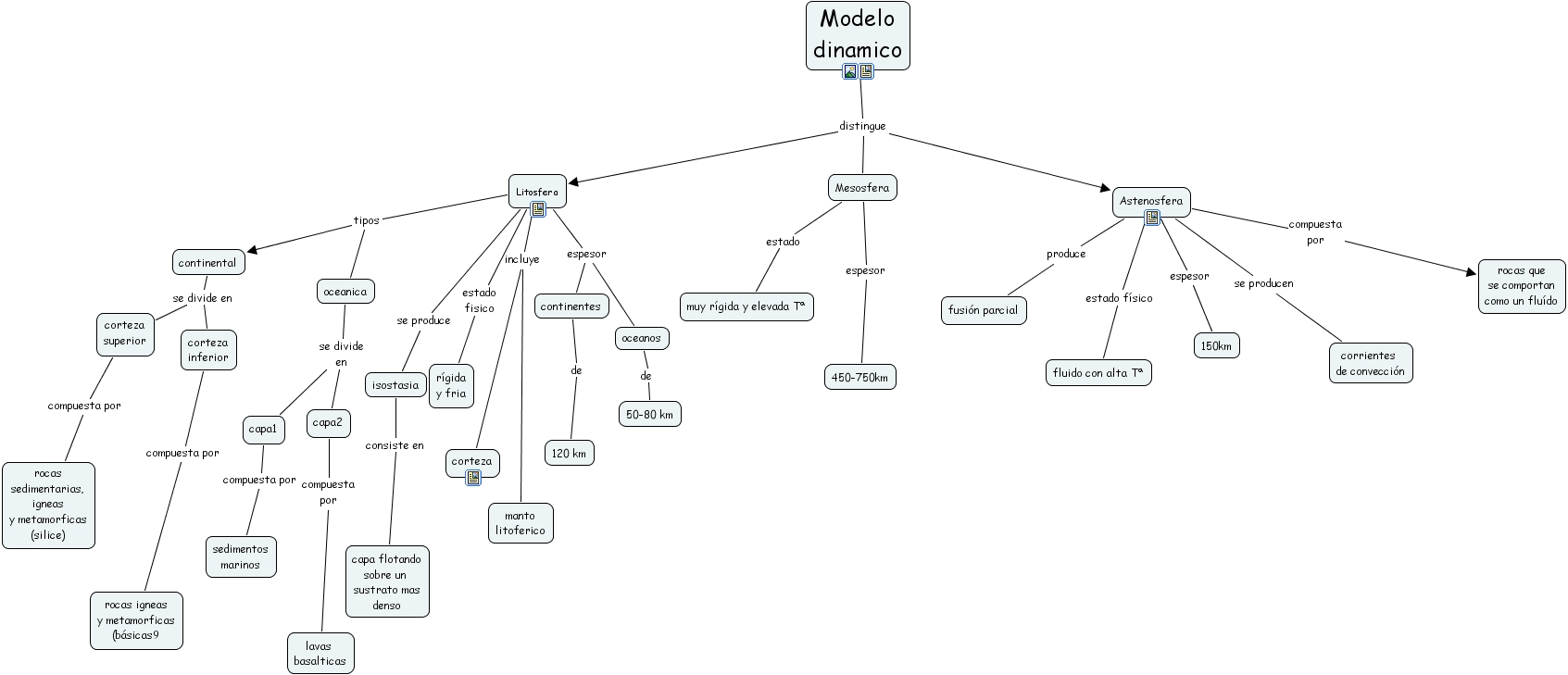 Astenosfera produce fusi�n parcial, Astenosfera estado f�sico fluido con alta T�, Astenosfera espesor 150km, Astenosfera compuesta por rocas que se comportan como un flu�do, Litosfera estado fisico r�gida y fria, corteza superior compuesta por rocas sedimentarias, igneas y metamorficas (silice), capa2 compuesta por lavas basalticas, Litosfera incluye corteza, Litosfera incluye manto litoferico, Mesosfera espesor 450-750km, Astenosfera se producen corrientes de convecci�n, capa1 compuesta por sedimentos marinos, Litosfera se produce isostasia, Modelo dinamico distingue Litosfera, Modelo dinamico distingue Mesosfera, Modelo dinamico distingue Astenosfera, oceanos de 50-80 km, Litosfera espesor continentes, Litosfera espesor oceanos, isostasia consiste en capa flotando sobre un sustrato mas denso, continental se divide en corteza inferior, continental se divide en corteza superior, corteza inferior compuesta por rocas igneas y metamorficas (b�sicas9, Litosfera tipos continental, Litosfera tipos oceanica, Mesosfera estado muy r�gida y elevada T�, continentes de 120 km, oceanica se divide en capa1, oceanica se divide en capa2