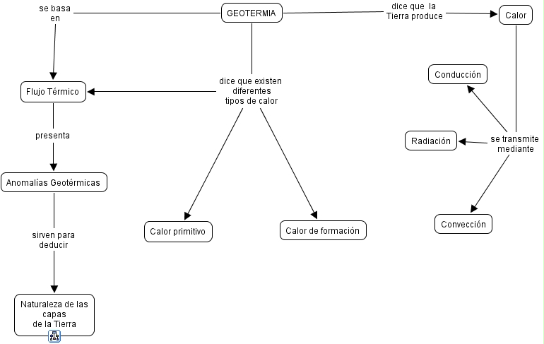 Métodos Geotérmicos, Anomalías Geotérmicas sirven para deducir Naturaleza de las capas de la Tierra, GEOTERMIA dice que existen diferentes tipos de calor Calor de formación, GEOTERMIA dice que existen diferentes tipos de calor Flujo Térmico, GEOTERMIA dice que la Tierra produce Calor, GEOTERMIA dice que existen diferentes tipos de calor Calor primitivo, Flujo Térmico presenta Anomalías Geotérmicas, Calor se transmite mediante Conducción, GEOTERMIA se basa en Flujo Térmico, Calor se transmite mediante Convección, Calor se transmite mediante Radiación