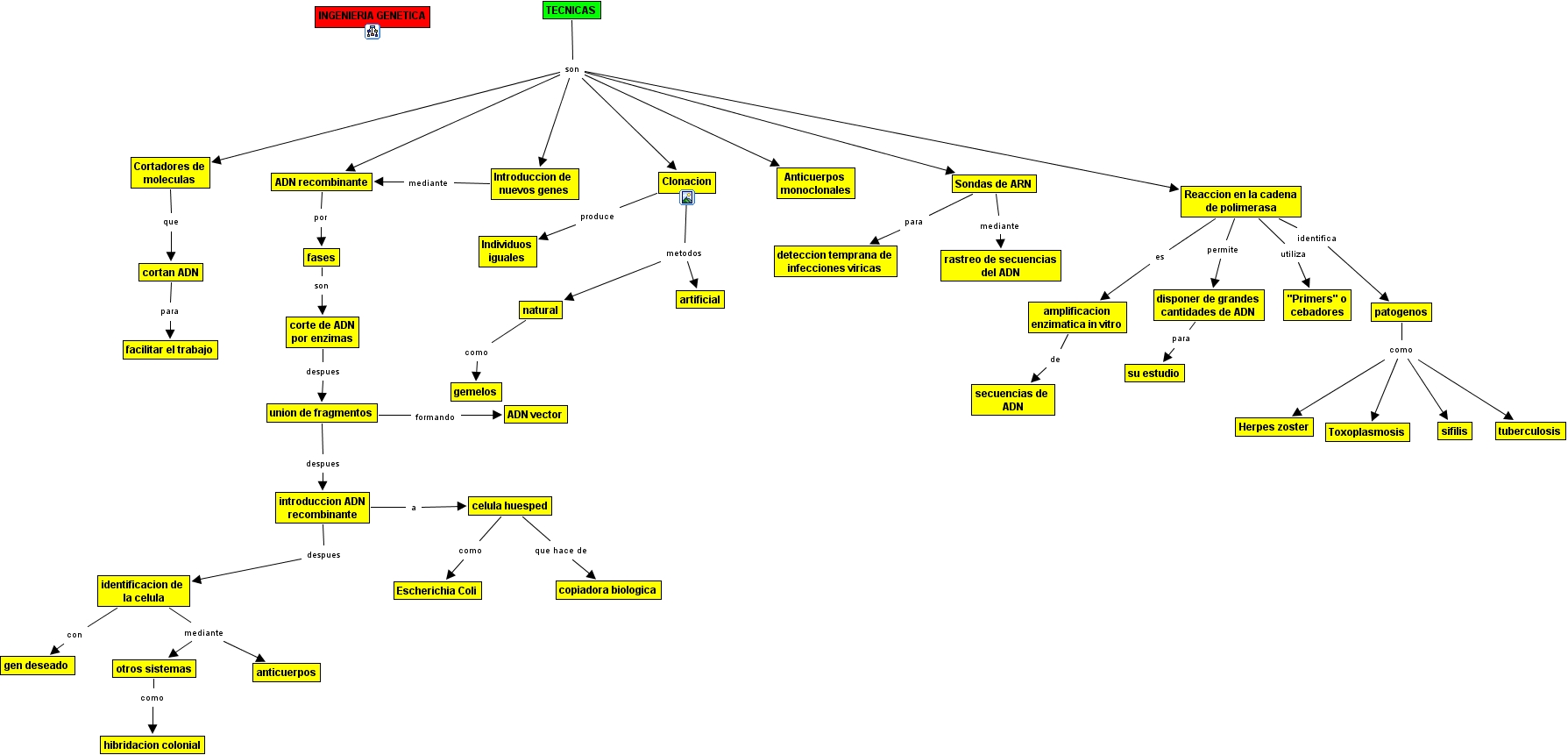 tecnicas, identificacion de la celula mediante anticuerpos, introduccion ADN recombinante a celula huesped, TECNICAS son Introduccion de nuevos genes, Clonacion metodos natural, TECNICAS son Clonacion, TECNICAS son Anticuerpos monoclonales, Clonacion produce Individuos iguales, TECNICAS son Sondas de ARN, Cortadores de moleculas que cortan ADN, fases son corte de ADN por enzimas
