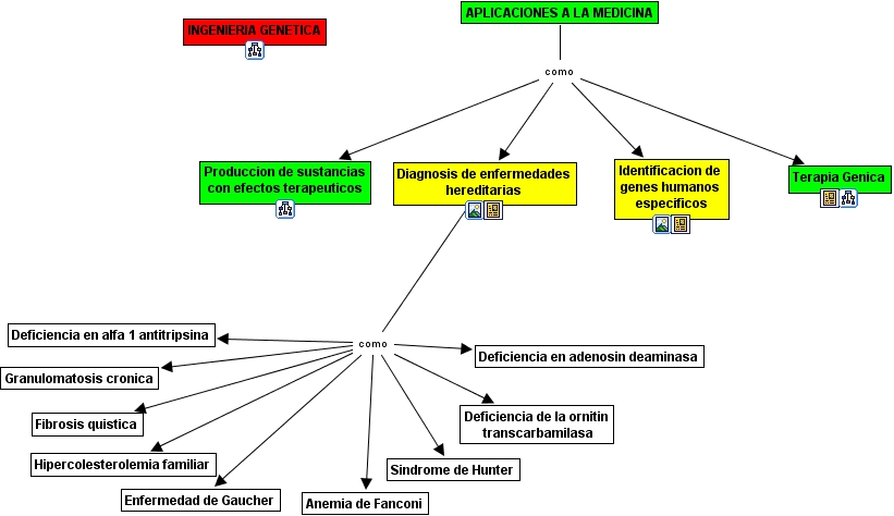 APLICACIONES EN MEDICINA, APLICACIONES A LA MEDICINA como Terapia Genica, APLICACIONES A LA MEDICINA como Produccion de sustancias con efectos terapeuticos, Diagnosis de enfermedades hereditarias como Granulomatosis cronica, Diagnosis de enfermedades hereditarias como Hipercolesterolemia familiar, Diagnosis de enfermedades hereditarias como Fibrosis quistica, Diagnosis de enfermedades hereditarias como Deficiencia de la ornitin transcarbamilasa, Diagnosis de enfermedades hereditarias como Enfermedad de Gaucher, Diagnosis de enfermedades hereditarias como Deficiencia en adenosin deaminasa, Diagnosis de enfermedades hereditarias como Anemia de Fanconi, Diagnosis de enfermedades hereditarias como Sindrome de Hunter