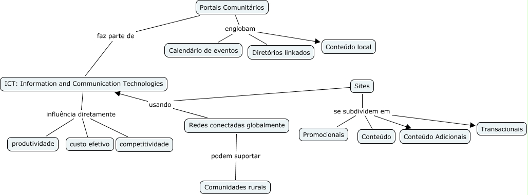 Esse mapa conceitual, produzido no IHMC CmapTools, tem a informação relacionada a: GrupoAcmap1TecnoApoioCI, Sites se subdividem em Promocionais, Portais Comunitários englobam Conteúdo local, ICT: Information and Communication Technologies influência diretamente custo efetivo, Sites se subdividem em Transacionais, Sites se subdividem em Conteúdo, Sites usando ICT: Information and Communication Technologies, Portais Comunitários faz parte de ICT: Information and Communication Technologies, ICT: Information and Communication Technologies influência diretamente competitividade, Portais Comunitários englobam Diretórios linkados, Portais Comunitários englobam Calendário de eventos, Redes conectadas globalmente podem suportar Comunidades rurais, ICT: Information and Communication Technologies influência diretamente produtividade, Redes conectadas globalmente usando ICT: Information and Communication Technologies, Sites se subdividem em Conteúdo Adicionais